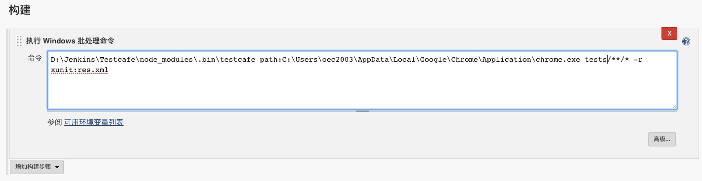 1 | D:\Jenkins\Testcafe\node_modules\.bin\testcafe path:C:\Users\oec2003\AppData\Local\Google\Chrome\Application\chrome.exe tests/**/* -r xunit:res.xml |