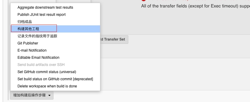 4、修改Jenkins中现有的前端项目的配置,增加构建后操作步骤,选择构建起他工程