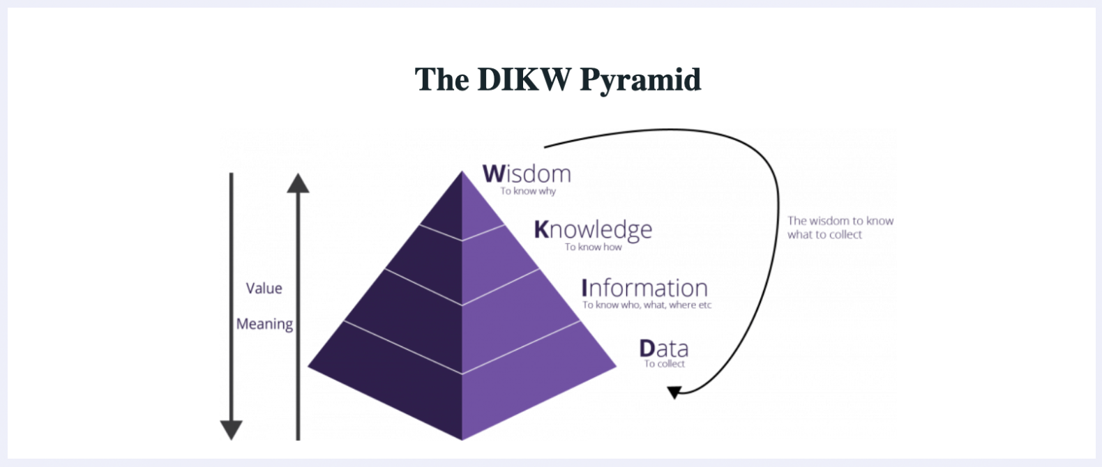 这个步骤和 DIKW 模型比较吻合,DIKW 模型是一个可以很好的帮助我们理解数据(Data)、信息(Information)、知识(Knowledge)和智慧(Wisdom)之间的关系的模型,可以参考下面这个图: