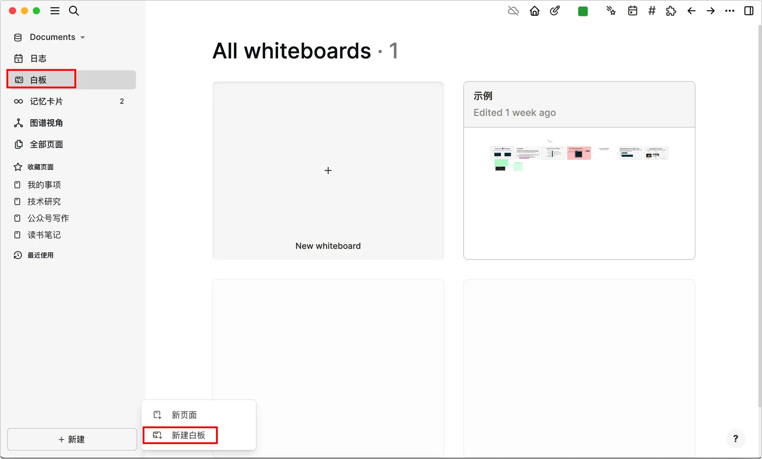 启用白板功能后,创建 Logseq 白板很容易。 使用边栏中的创建按钮,或从新的白板页面添加画布。
