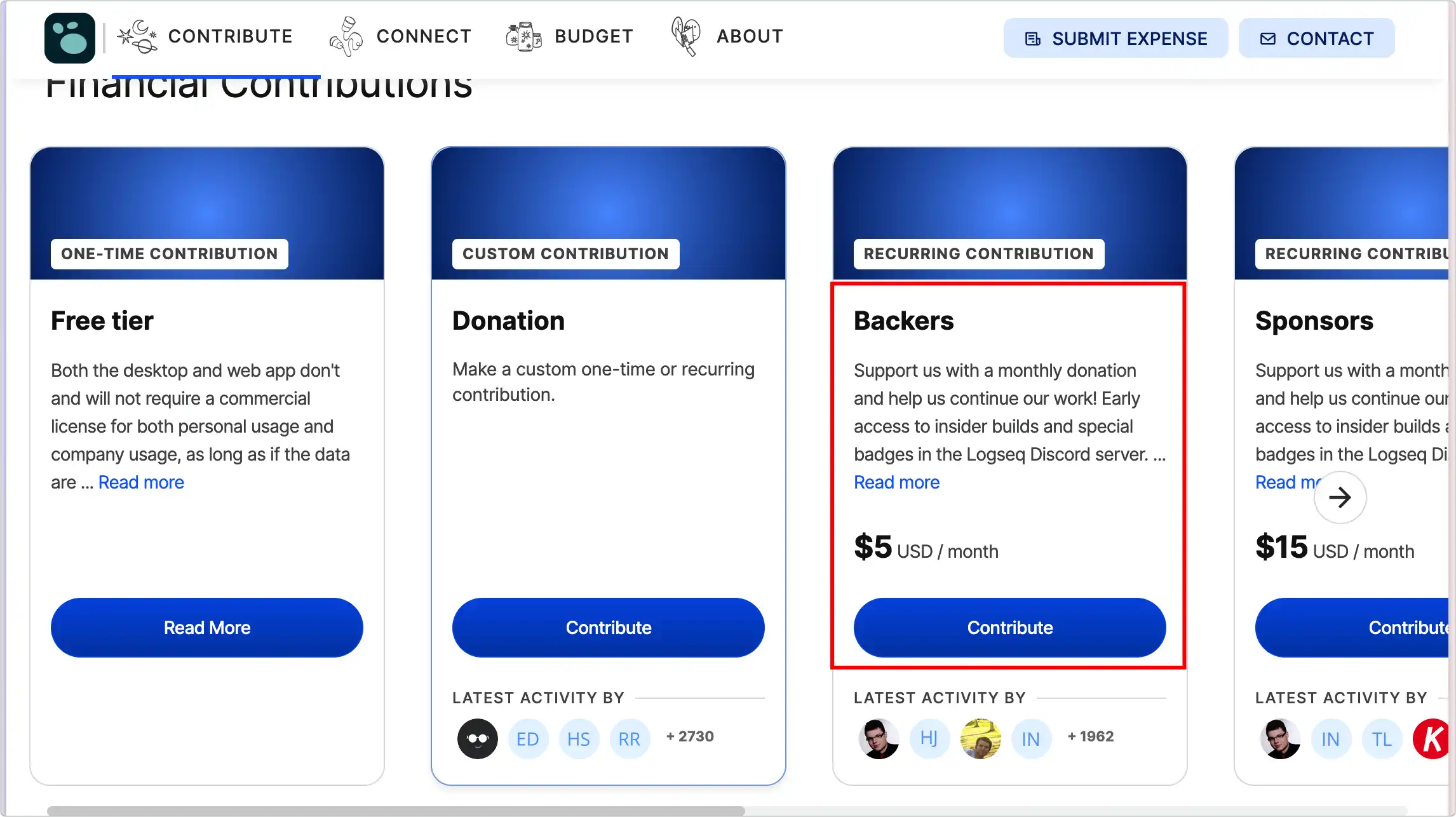 1、成为 Open Collective ( https://opencollective.com/logseq ) 的 Logseq Backers 或 Sponsors ;