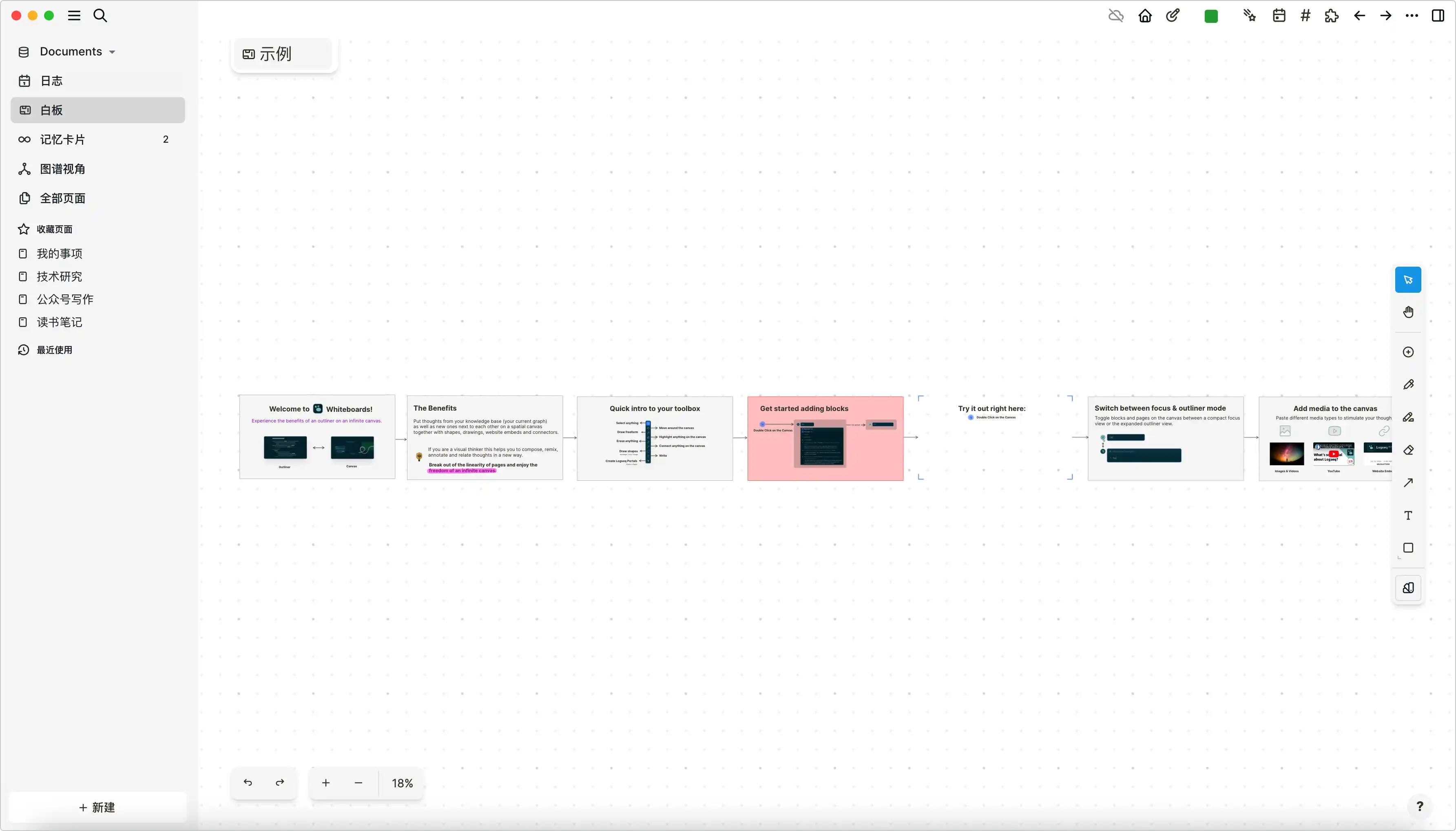 目前,Obsidian 中的白板功能的完成度还是挺高的,也期待后面版本推出更多好的特性。下面再来看看 Logseq 中的白板吧。
