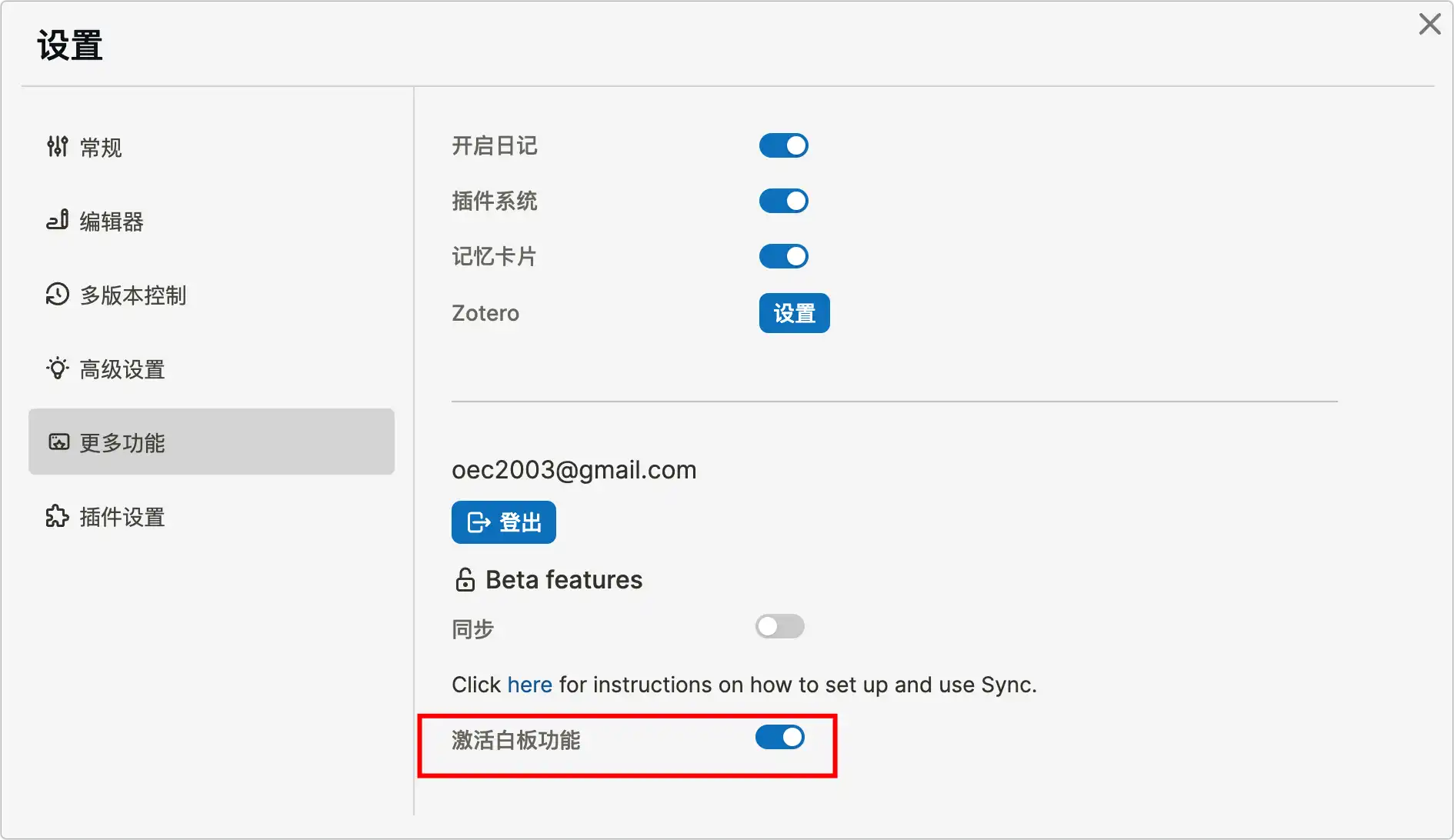3、登录并在您的 Logseq 设置中启用白板功能,只有付费成为了 Backers 或 Sponsors 后,这里的激活白板功能才能开启。