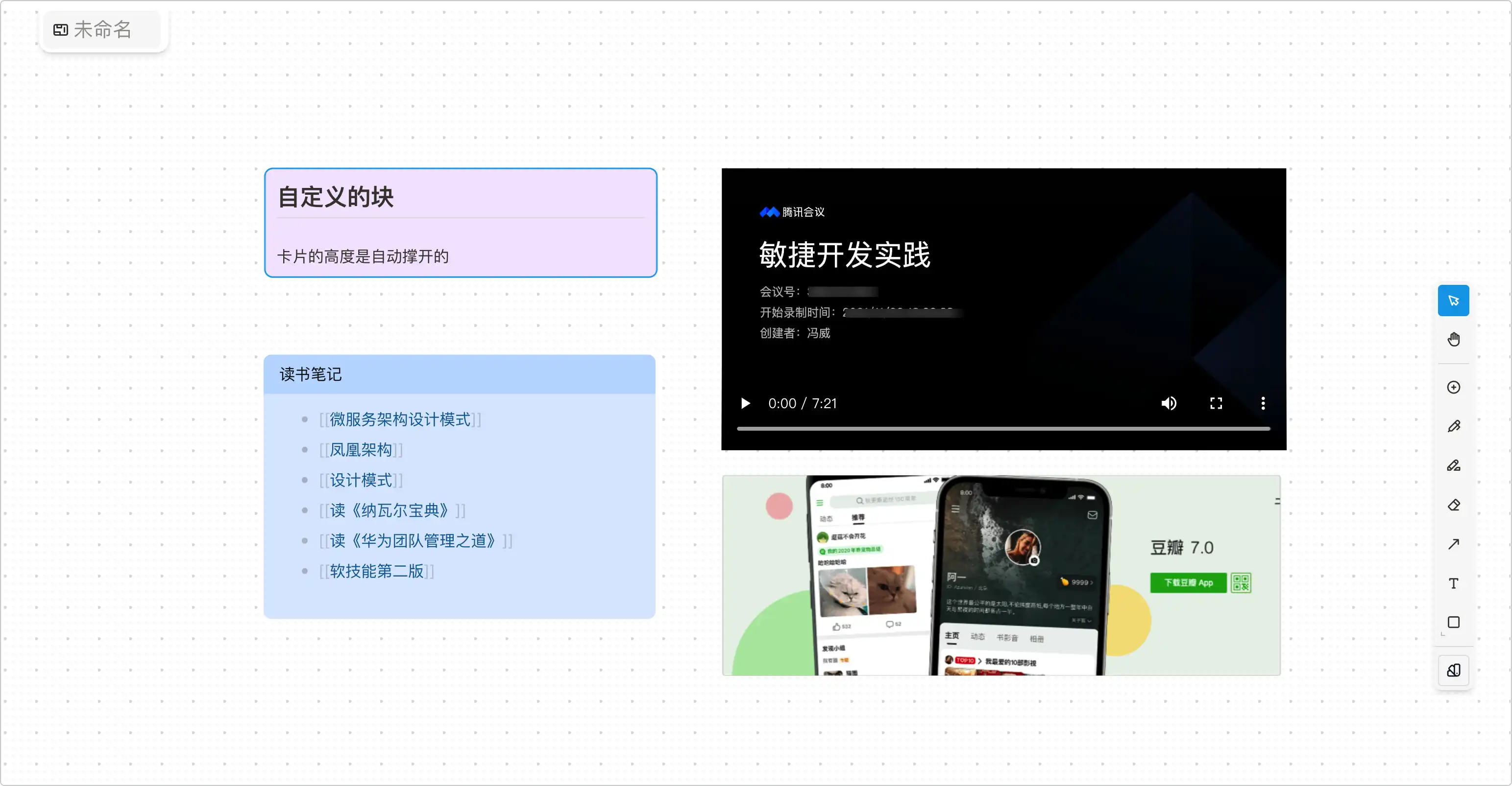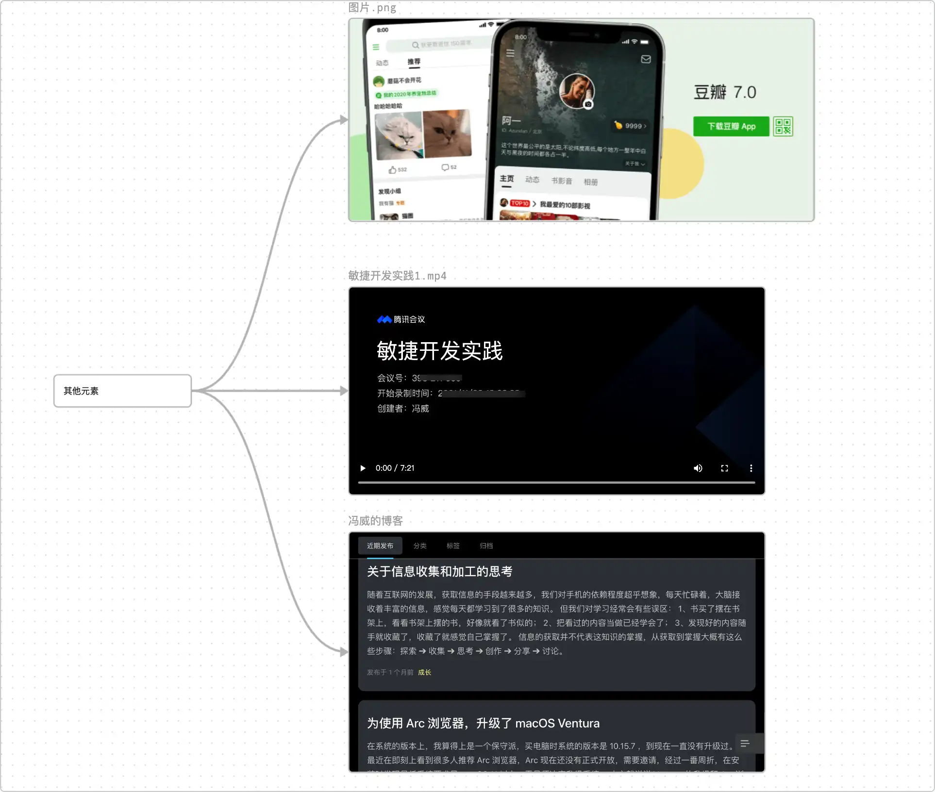 7、除了卡片之外,白板中还能贴图片、视频、和网站链接,厉害的是视频可以直接在卡片中播放,这三种元素也可以和普通卡片进行连接: