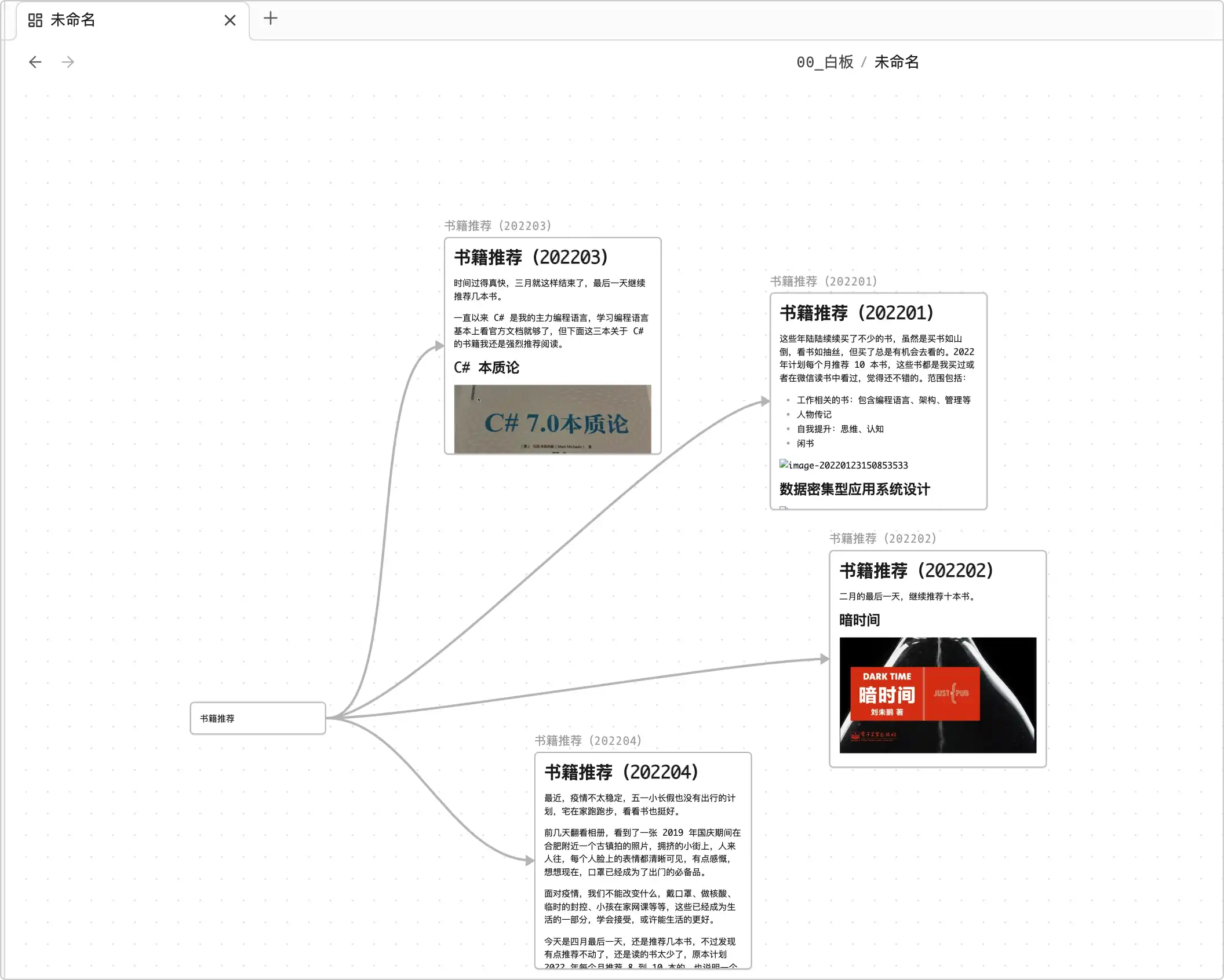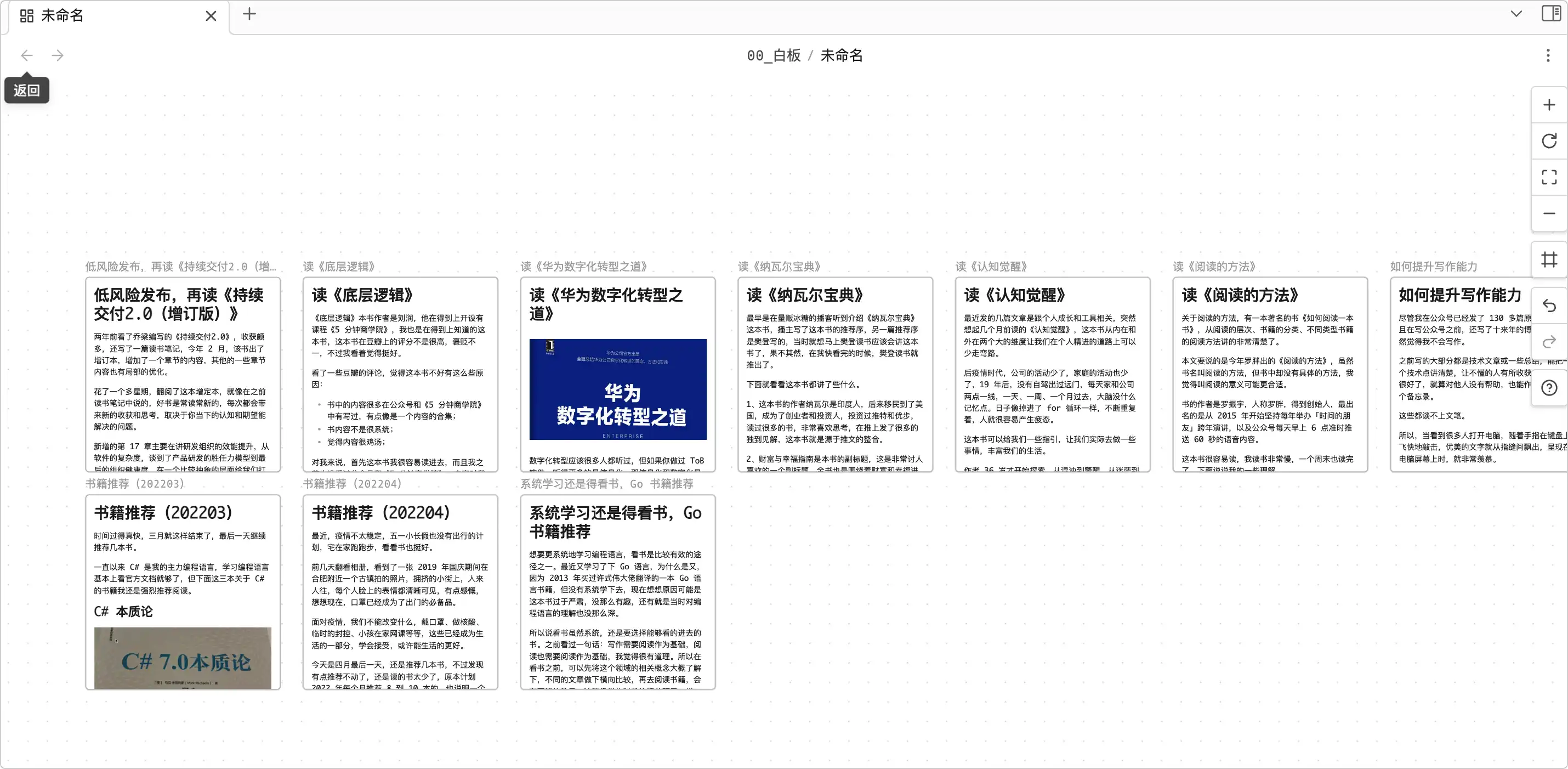 2、可以将左边的单个笔记或者文件夹直接拖到白板中,直接拖拽一个文件夹的效果如下,文件夹下的每一个笔记都作为一个卡片展示在白板中: