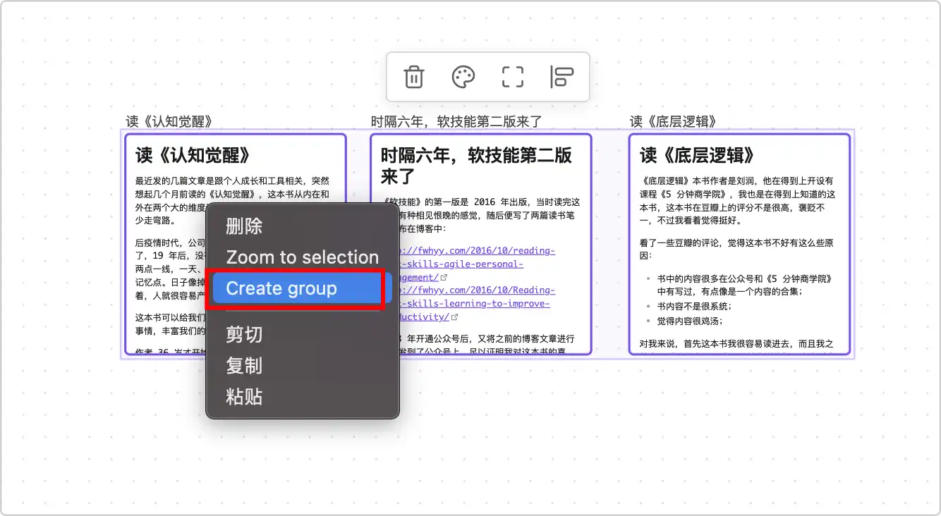 我经常说通过输出来倒逼输入,那么从输入到输出的中间环节,就需要对信息进行组织加工。这个加工的过程,之前可能在我们的脑子中、也可能是画画思维导图,而现在可以使用 Obsidian 的白板来进行。