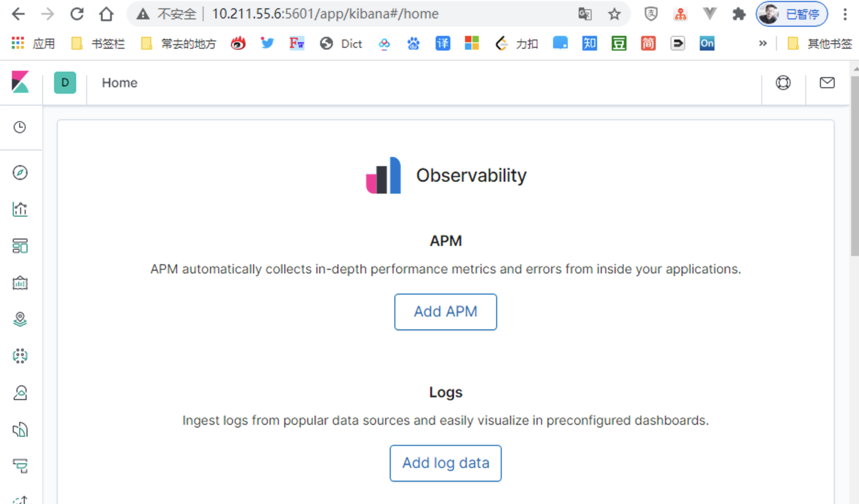 创建成功后,访问 5601 端口,出现如下界面说明创建成功: