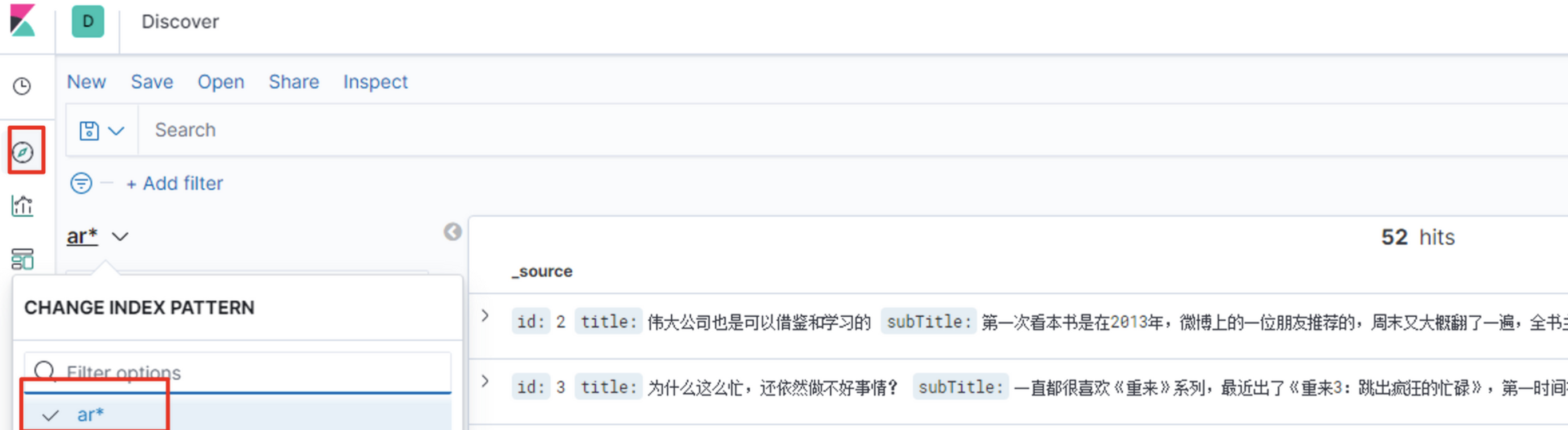3、在 Discover 菜单中进行数据查看,在这里可以选择之前创建的 index pattern