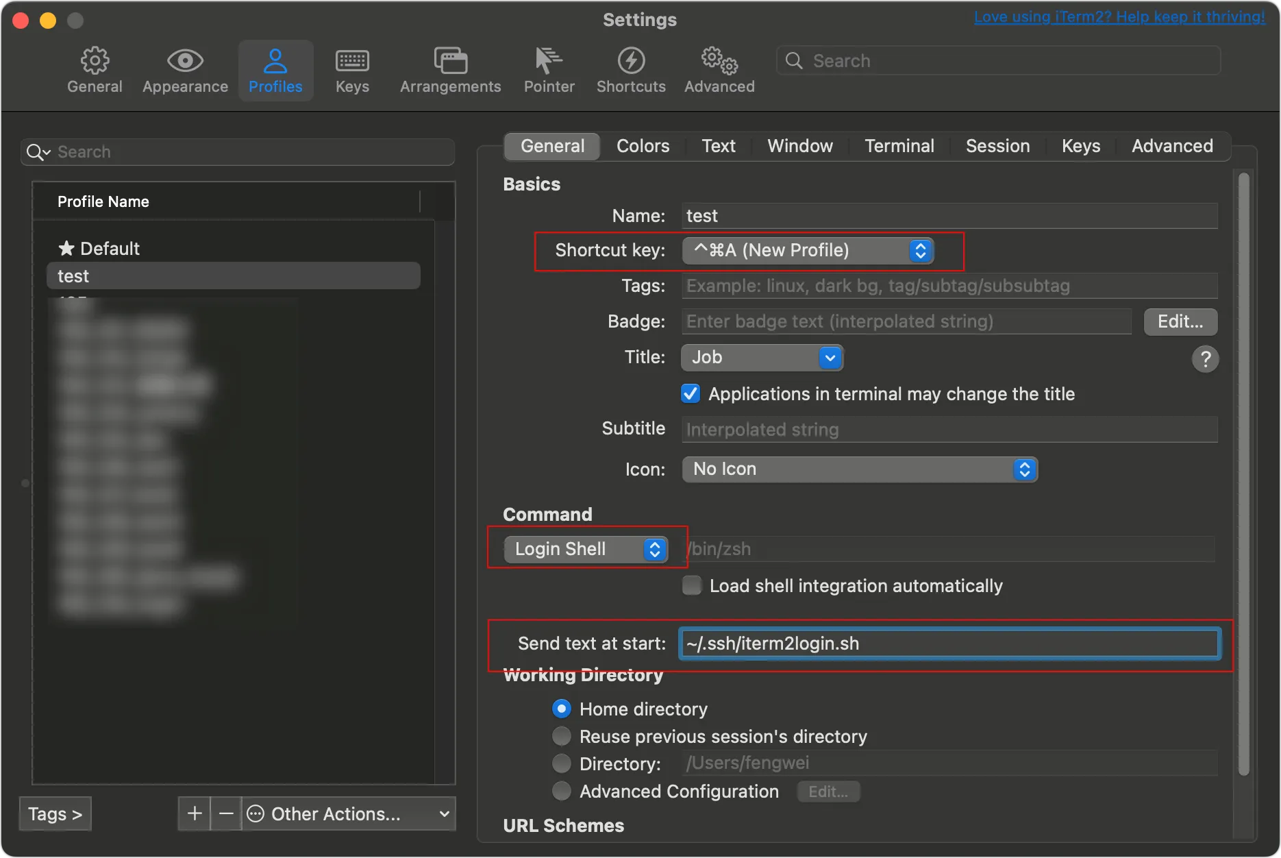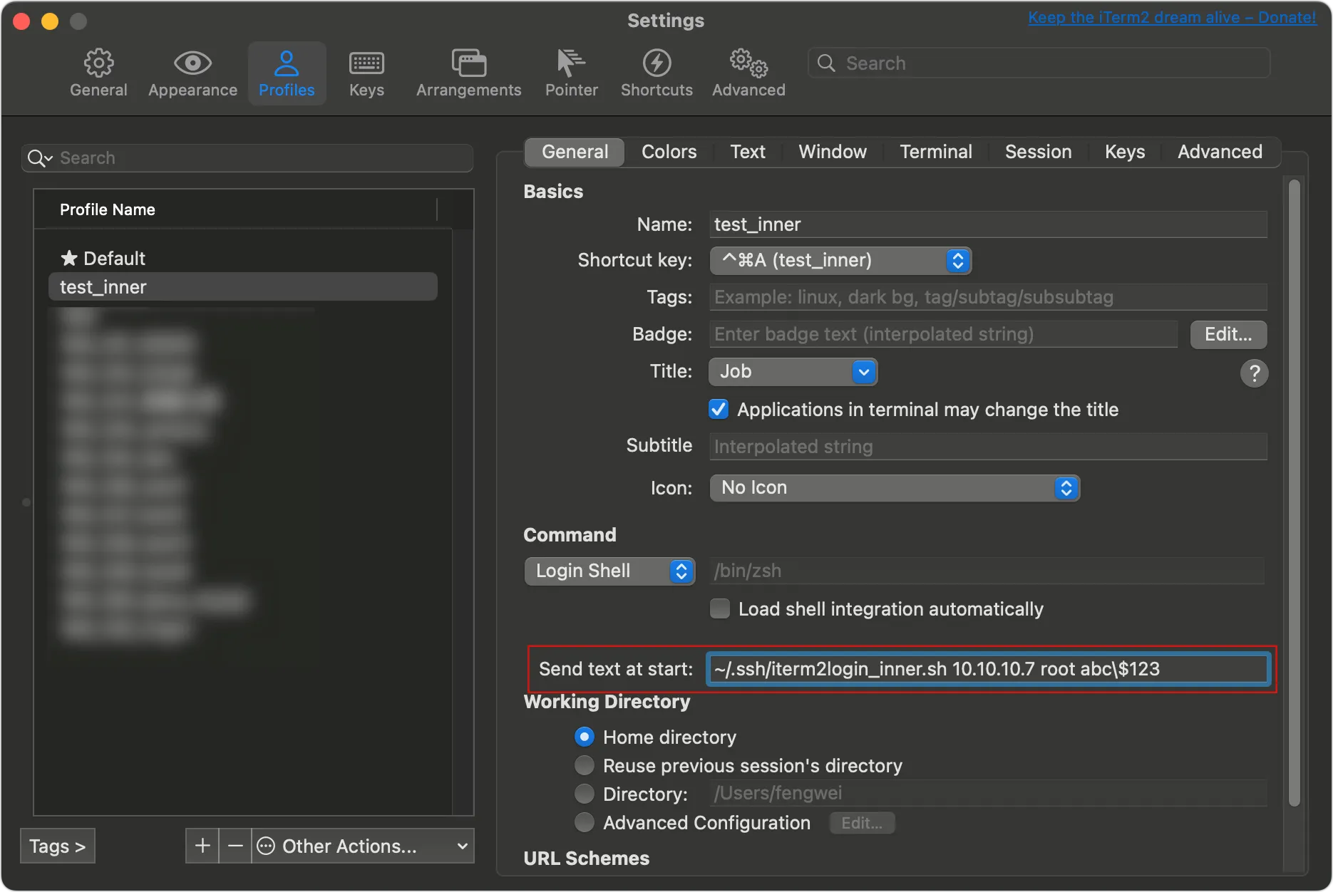 - 因为上面的 iterm2login.sh 是没有参数的,所以 Send text as start 直接配置这个文件名即可