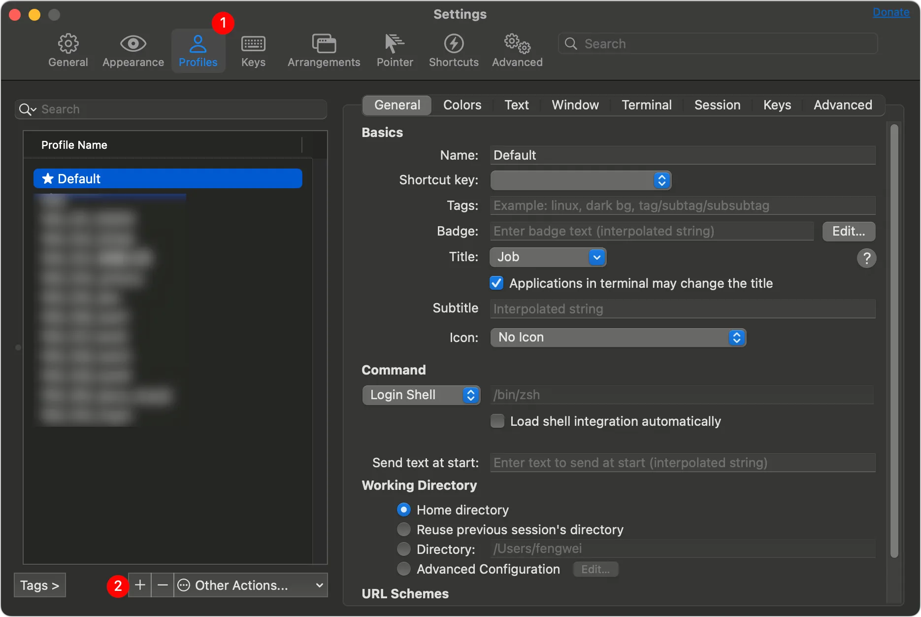 2、输入 Command+, 打开 iTerm2 的设置界面,如下图,点击加号添加一个新的 Profile :