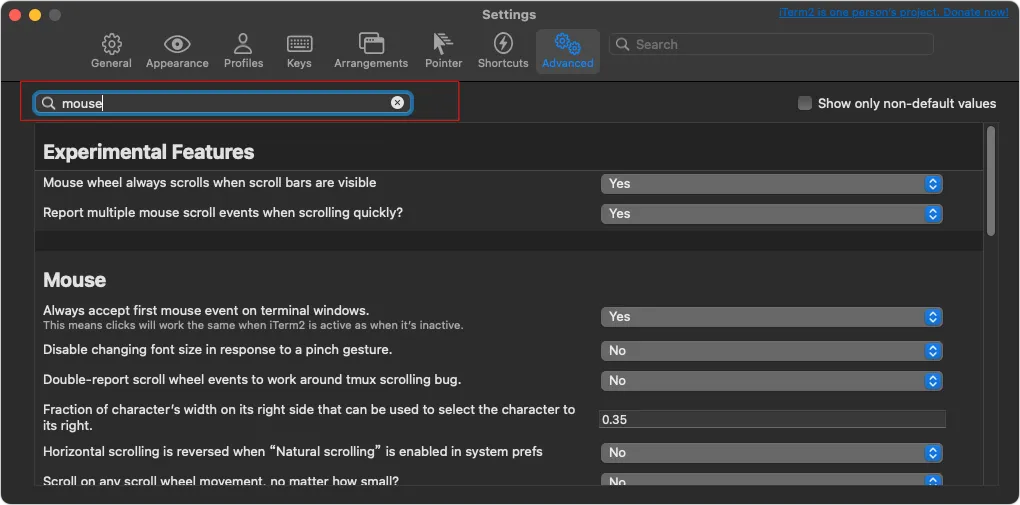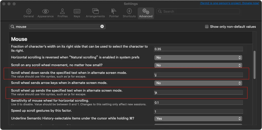之前使用 Termius ,使用 vi 打开一个文件时,可以使用触模板或者鼠标的滚轮进行快速浏览文件内容,但在 iTerm2 中默认是没有开启的,可以按照下面设置进行开启: