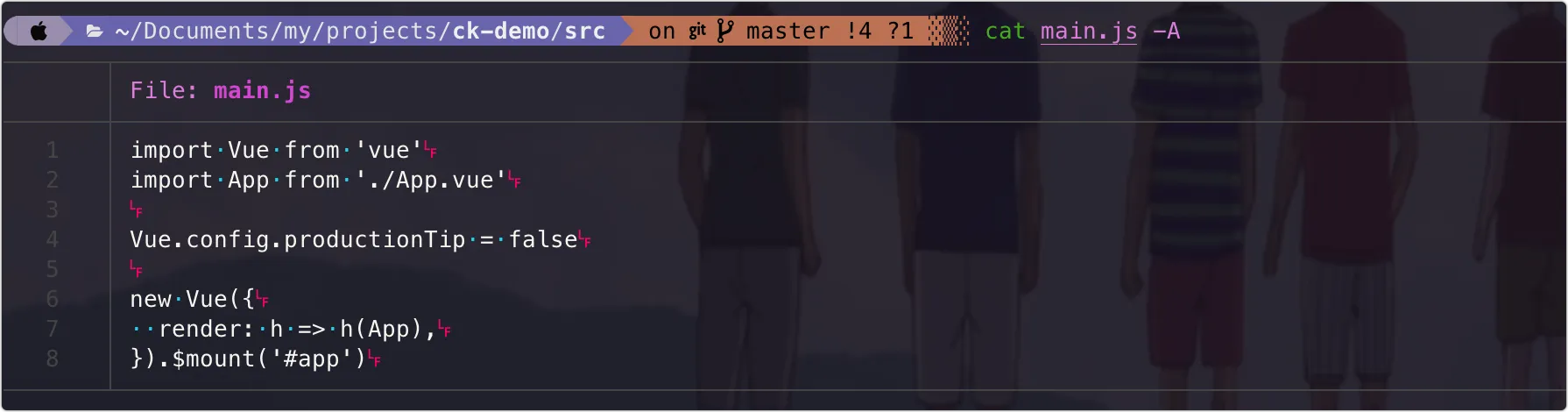 使用命令 cat main.js -A就可以看到,空格、换行等都能显示,如果有中文还会转为 Unicode 编码: