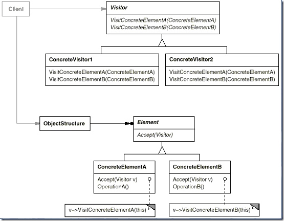 在软件构建过程中,由于需求的改变,某些类层次结构中常常需要增加新的行为(方法),如果直接在基类中做这样的更改,将会给子类带来很繁重的变更负担,甚至破坏原有设计。如何在不更改类层次结构的前提下,在运行时根据需要透明地为类层次结构上的各个类动态添加新的操作,从而避免上述问题?请看下面访问者模式结构图和代码。