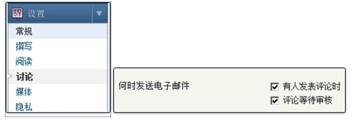 2 进入WordPress后台,在“设置”选项卡中点击讨论,在右边的界面中配置何时发送电子邮件。