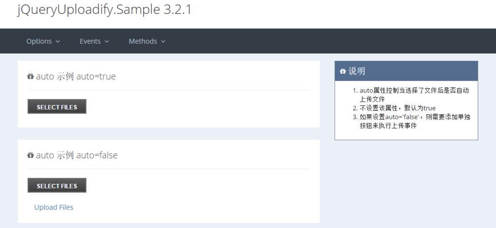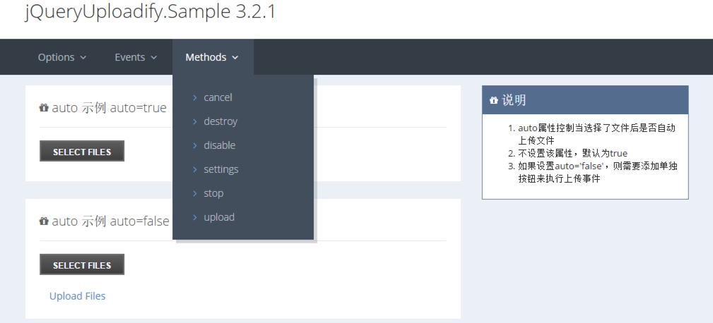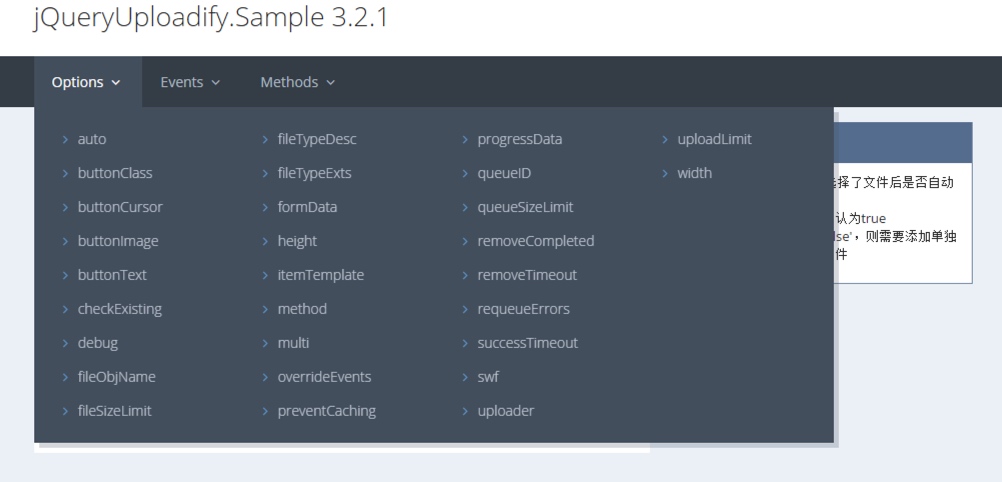 Uploadify 的使用分为属性配置,事件和方法三大块,根据官方文档,我将这三部分内容写了一个示例项目放在 Github 上,不抵触英文的建议直接看官方文档,下面是示例的一些截图: