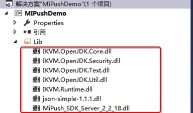 遗憾的是小米推送官方并不支持C#,所以需要很对Java版本的实现用IKVM来做一些转化。转换后在Net程序中一共需要引用7个Dll文件,如下图: