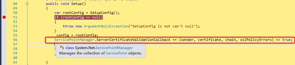从错误信息可以得知是在验证证书时出的问题,网上查到很多都是Java版本的解决方式,思路就是忽略SSL的验证,找了下C#的相关代码,如下图: