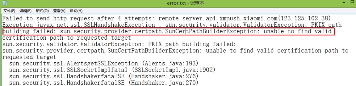 在测试阶段,推送一直没什么问题,当部署到客户服务器上后,就推送失败,错误日志如下图: