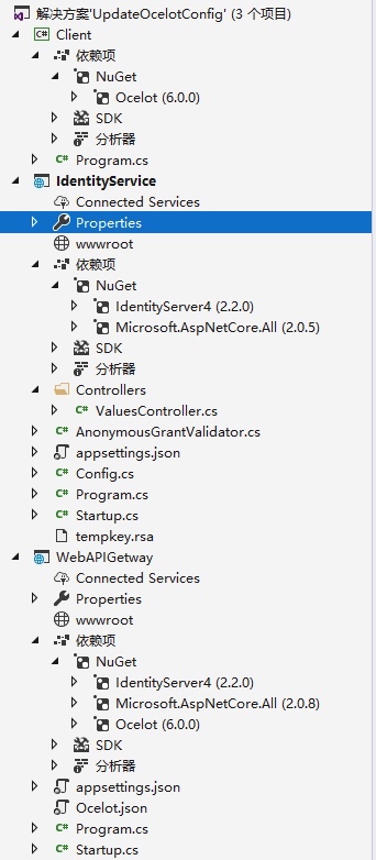 通过Postman来进行测试如果能够验证通过,说明WebAPIGetway和IdentityService都运行正常,下面在Client项目中用代码的方式来进行配置文件的修改。Client代码如下: