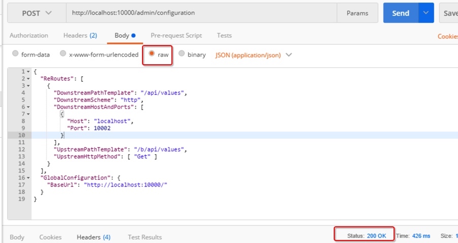 | { "ReRoutes": [ { "DownstreamPathTemplate": "/api/values", "DownstreamScheme": "http", "DownstreamHostAndPorts": [ { "Host": "localhost", "Port": 10001 } ], "UpstreamPathTemplate": "/a/api/values", "UpstreamHttpMethod": [ "Get" ] } ], "GlobalConfiguration": { "BaseUrl": "http://localhost:10000/" } }