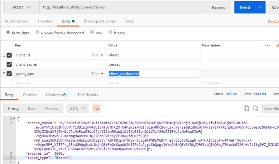 2、在Postman中调用 http://localhost:9500/connect/token,获取token,调用方式为Post,form-data传三个参数: