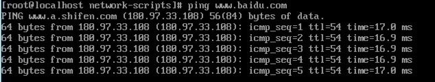 5、修改完后执行:wq进行保存退出,执行systemctl restart network重新启动网络服务,这时再ping下百度,如果出现下图内容表示网络已经通了。