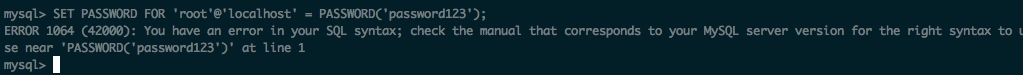 1 | SET PASSWORD FOR 'root'@'localhost' = PASSWORD('password123'); |
