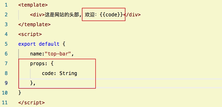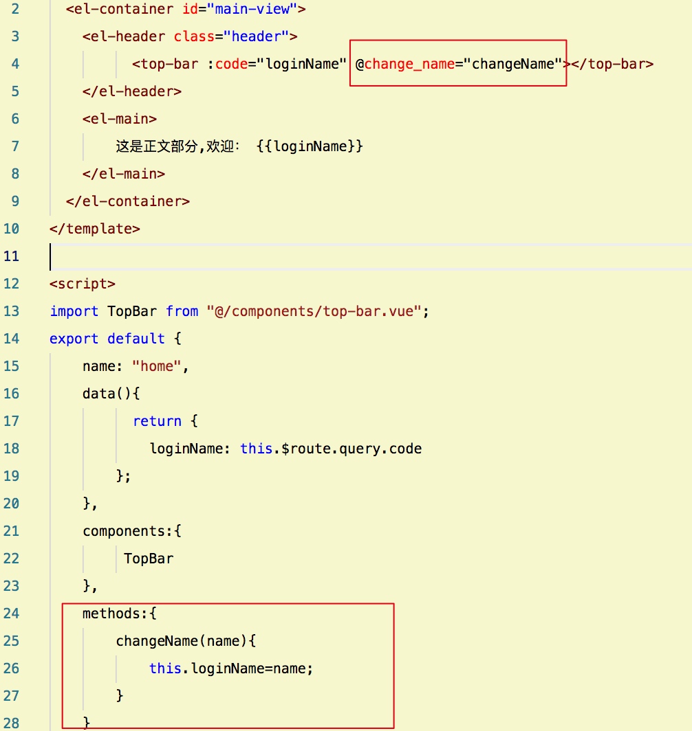 父组件传递数据到子组件的方法是在子组件定义 props ,本例中将 home 组件接收到的登录名传递到 top-bar 组件中。