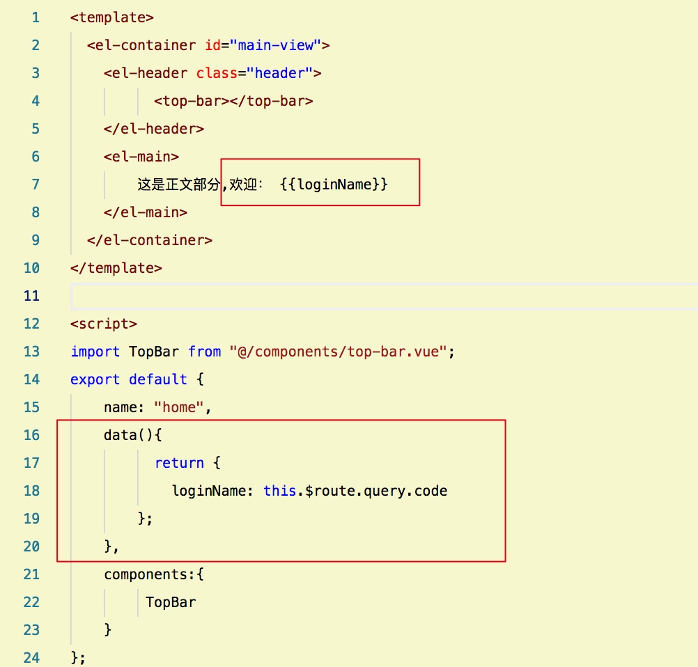 登录成功后,将登录名传递到 home 组件中,通过路由传参的方式有很多中,这里使用 query 的方式