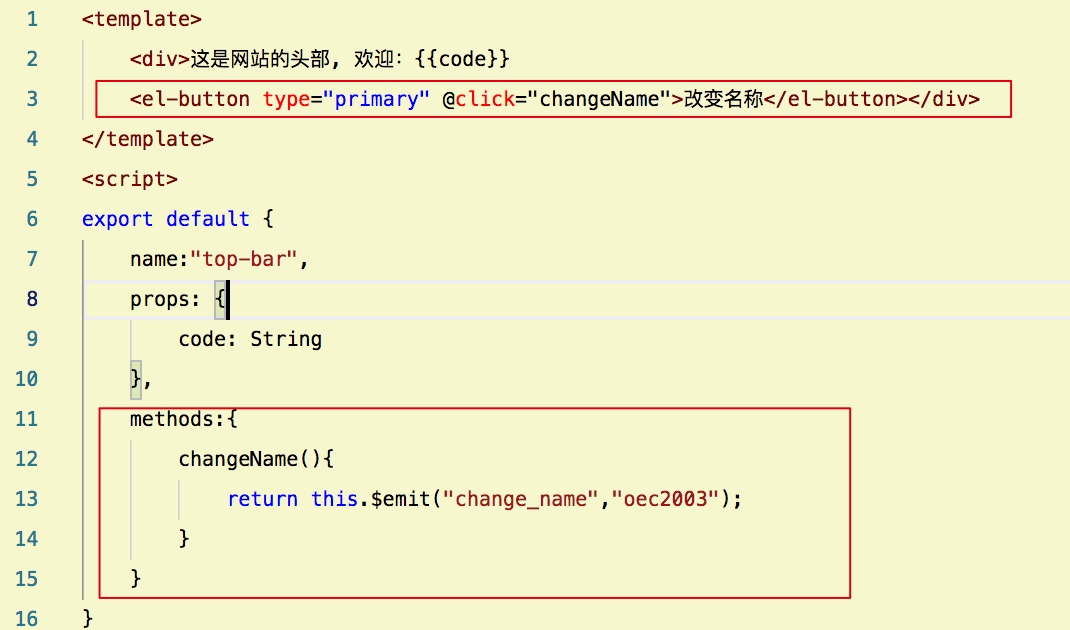 子组件传递到父组件使用 $emit ,本例中在 top-bar 组件中添加一个按钮,点击按钮传递参数到 home 组件,并改变 home 组件的 loginName的值。