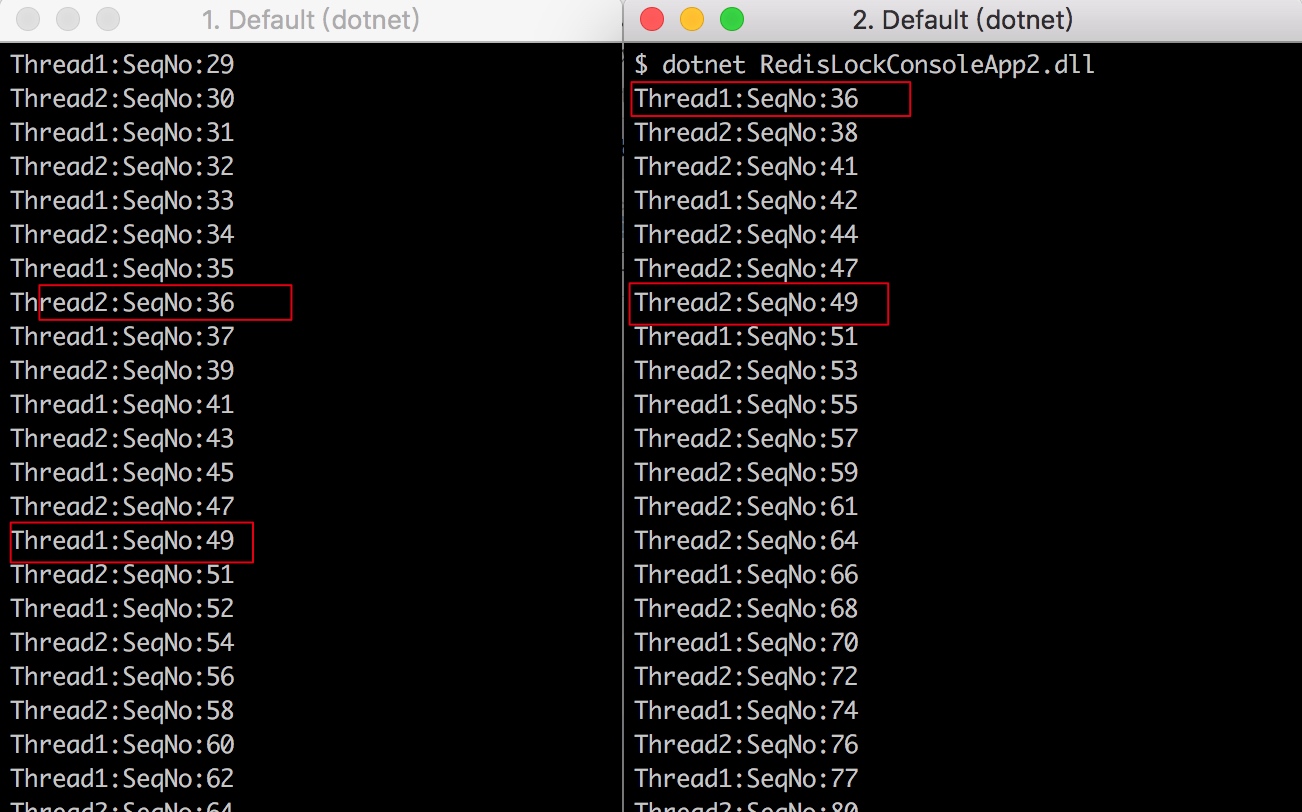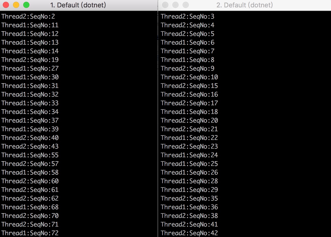 Task.Run(() => { for (int i = 0; i < 50; i++) { Console.WriteLine($"Thread2:SeqNo:{SeqNo.GetSeqNoByNoLock()}"); } }); Console.ReadLine(); } }