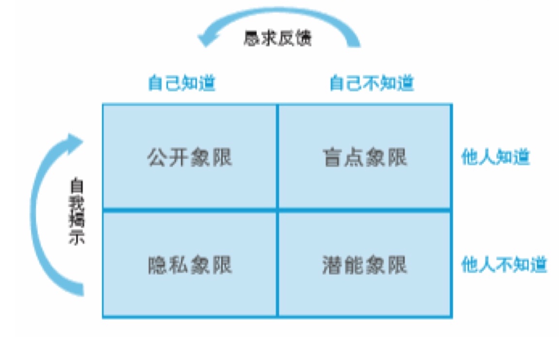 盲点象限是,自己不知道,但别人知道。就是说我们自己有很多缺点,身边的人又没有当面直接指出,我们对自己身上的缺陷就无法得到正确的认知。