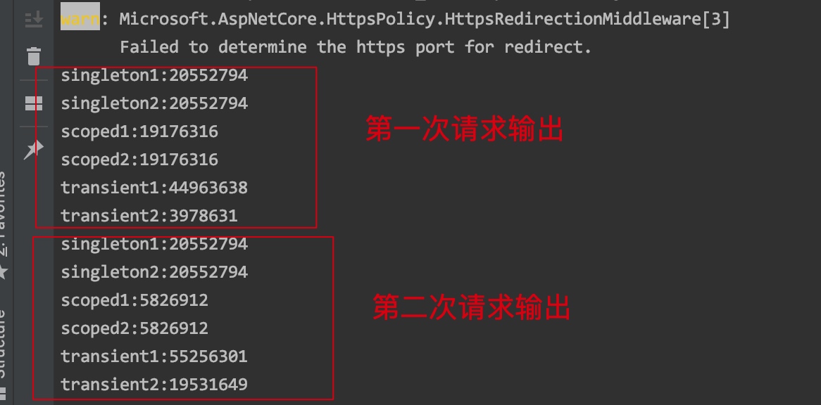测试示例中每个不同生命周期的对象都通过 FromServices 的方式注入了两次,分析结果如下: