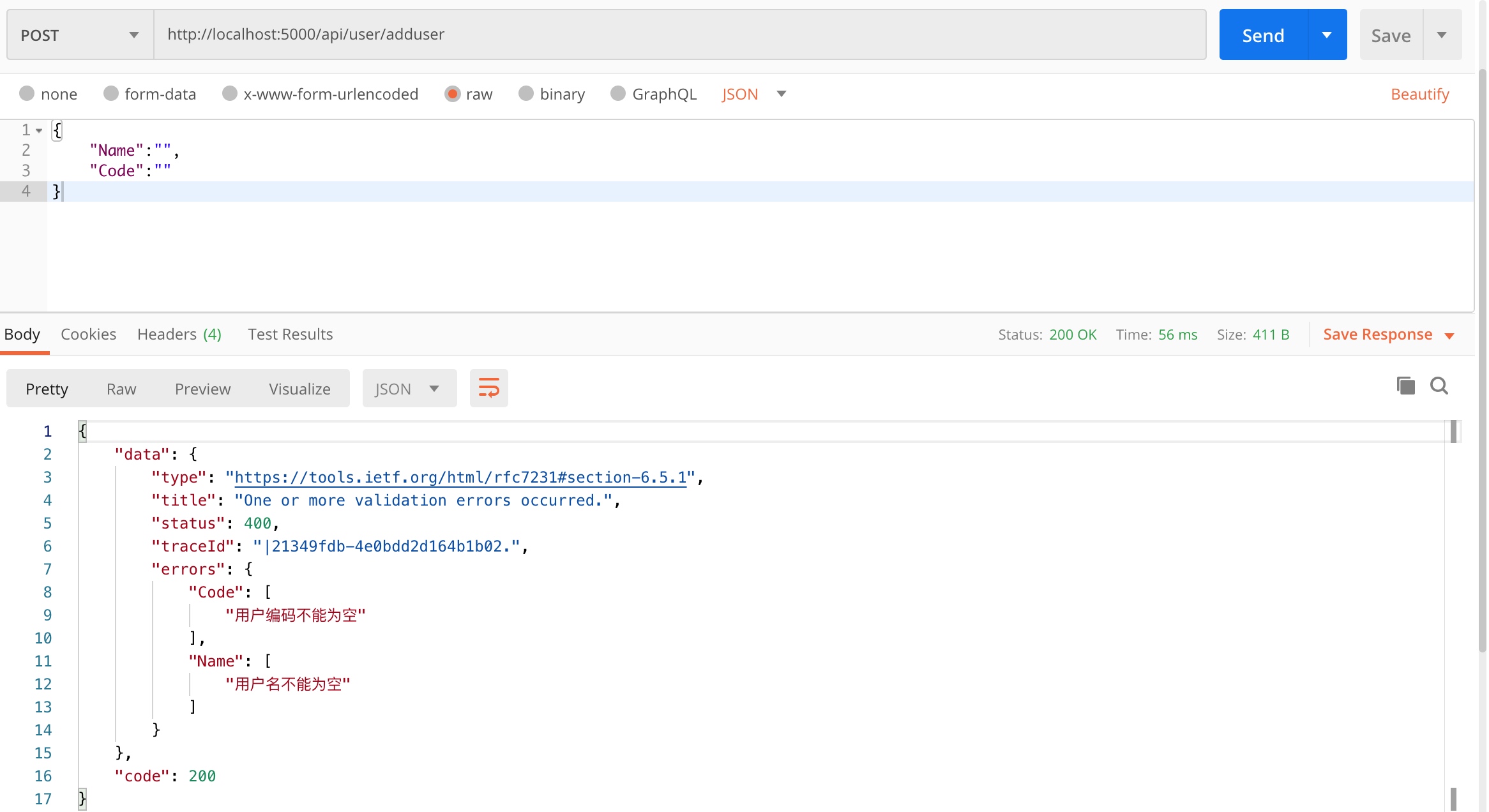 在 Controller 层的 AddUser 方法也需要对入参实体进行检查