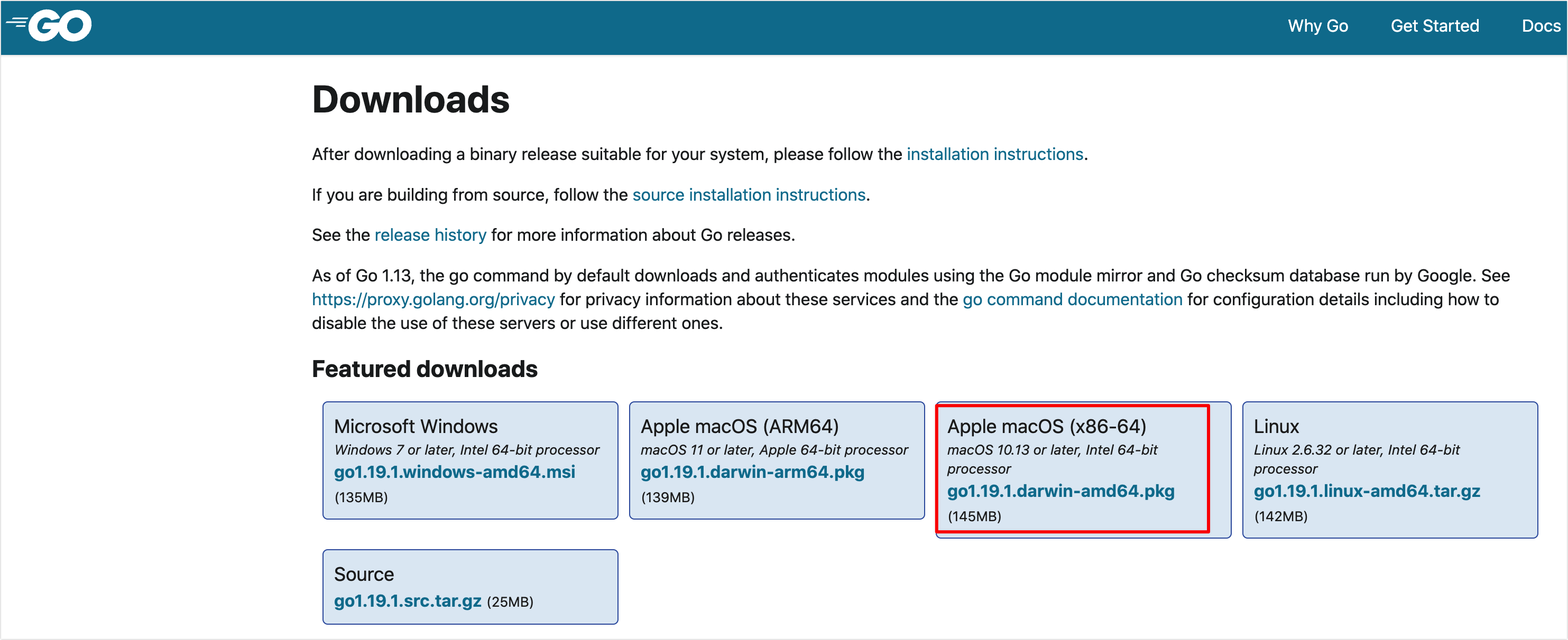 1、在 https://go.dev/dl 页面下载 Mac 版本的 pkg 安装文件: