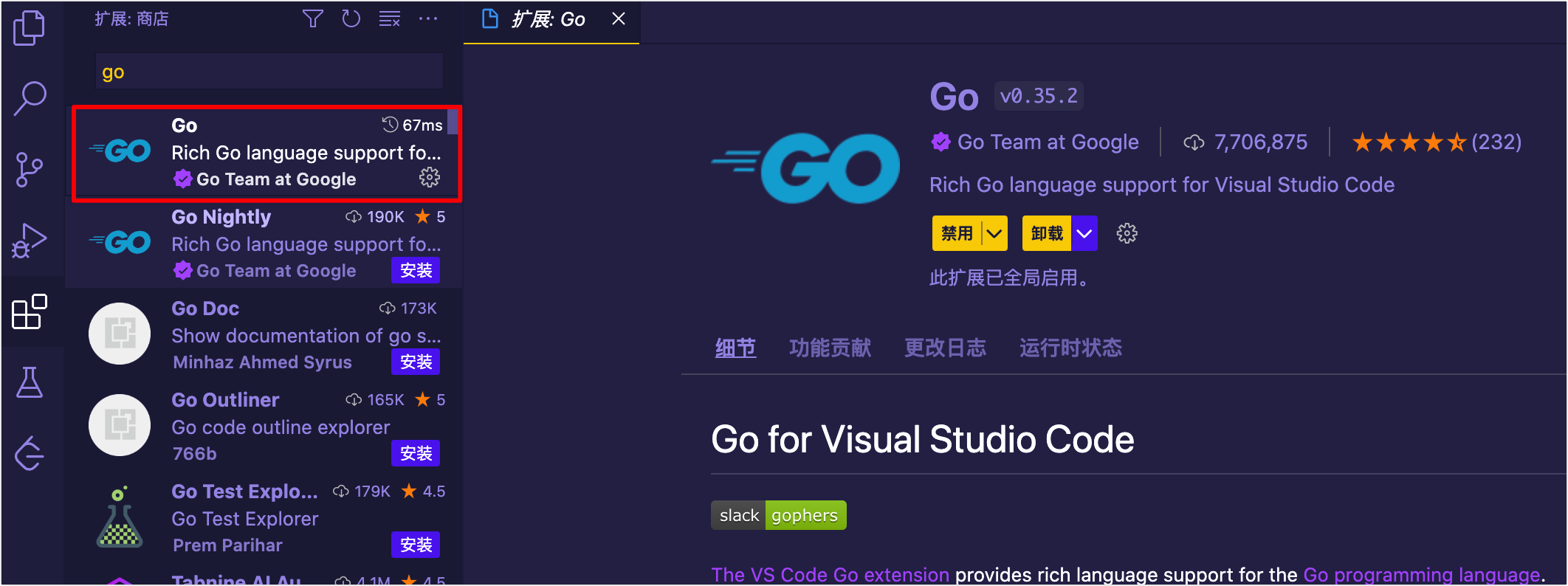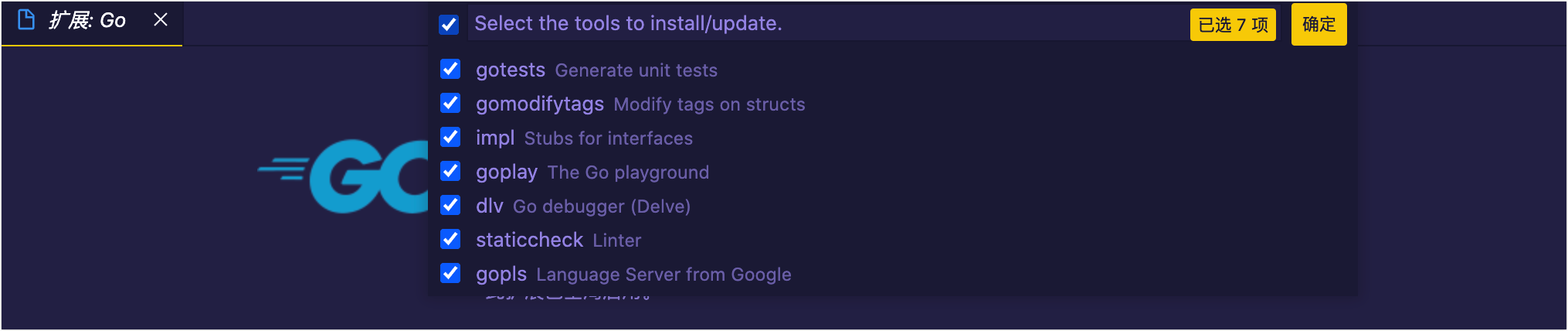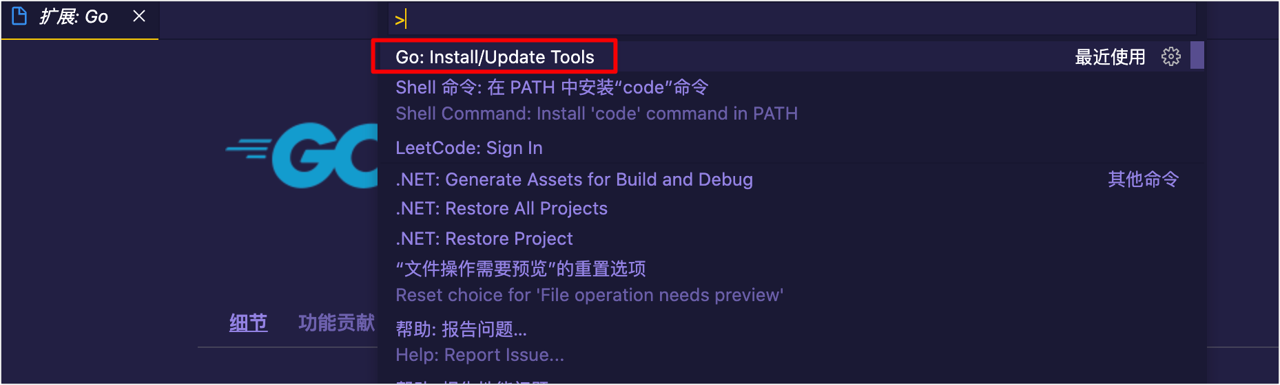 5、在 VS Code 中敲 cmd+shift+p ,然后输入 Go:Install ,选择下图红框部分进行扩展工具的安装;