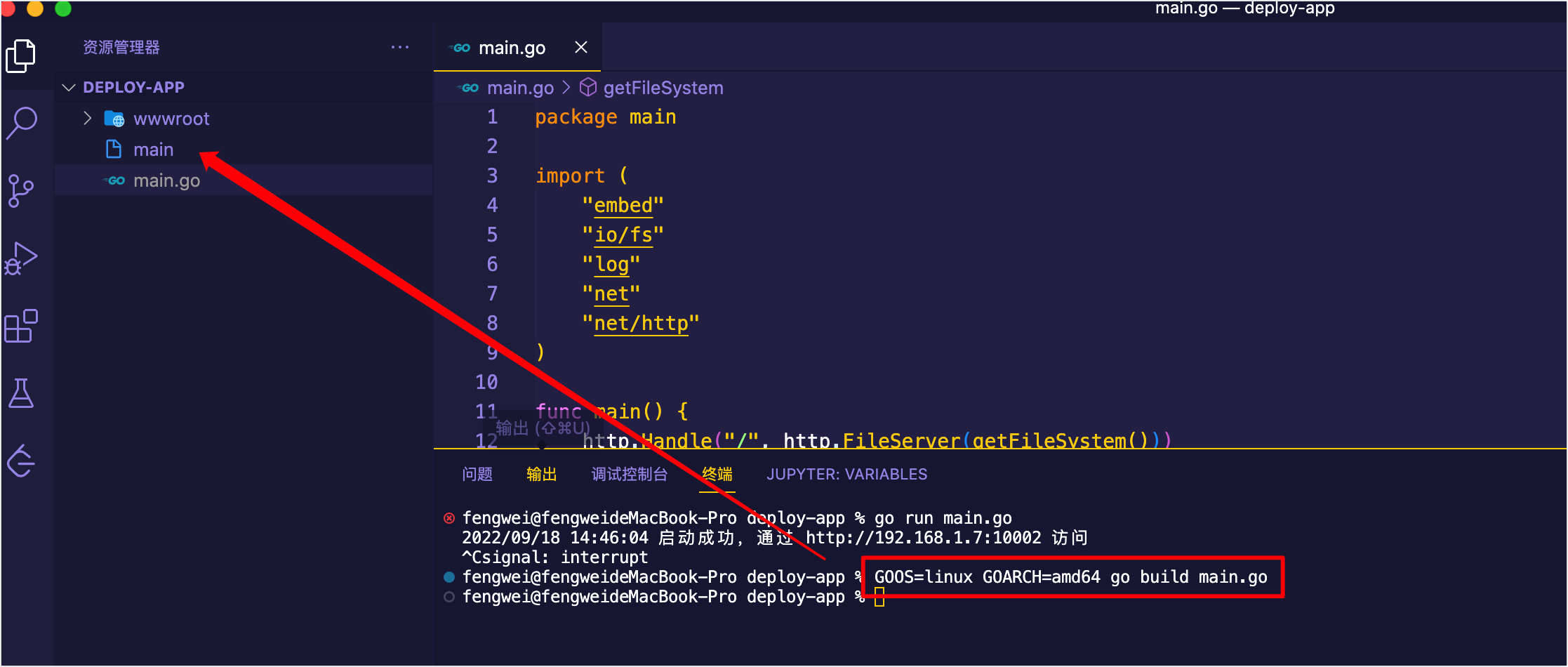 4、使用命令 GOOS=linux GOARCH=amd64 go build main.go 进行编译构建,构建完成后会在 deploy-app 目录中生成一个名为 main 的二进制文件,如下图: