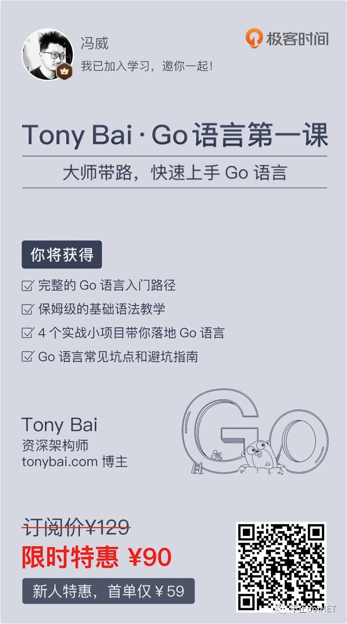 在出版这本书之前,Tony Bai 还在极客时间开设了一个关于 Go 的入门级专栏 《Tony Bai · Go 语言第一课》,有兴趣可以去看看: