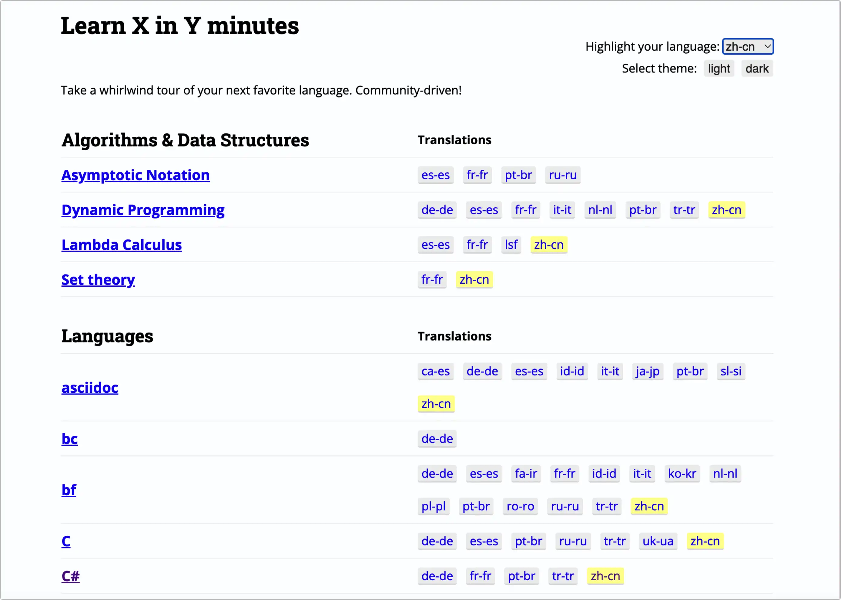 基本涵盖了从 a 到 z 的所有语言,大部分都有中文版本,特点就是非常的极简,没有任何的废话,每种语言的介绍都在一个文件中,以 code 后注释相结合的方式呈现。