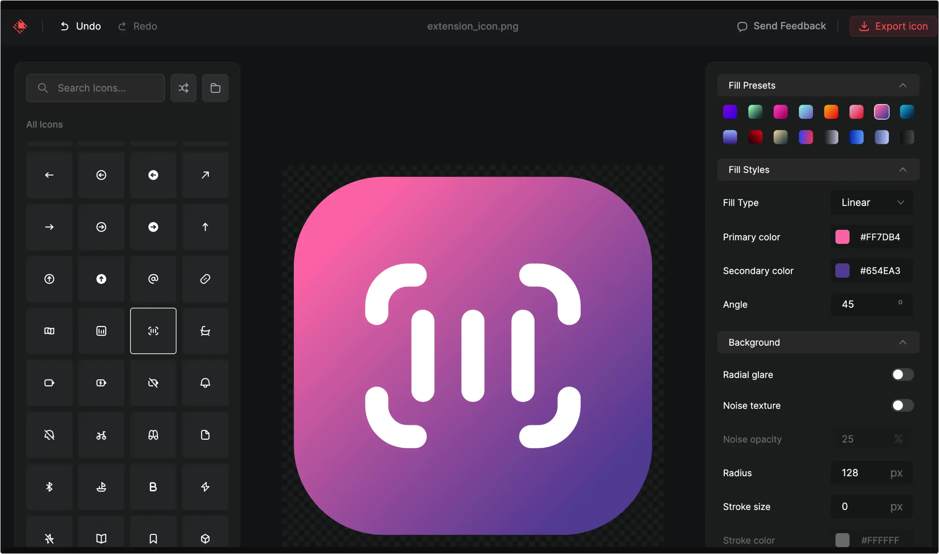 选择库里的图标(暂不支持上传自己的图标),可以方便地添加背景颜色、渐变和纹理,可导出 png 格式。