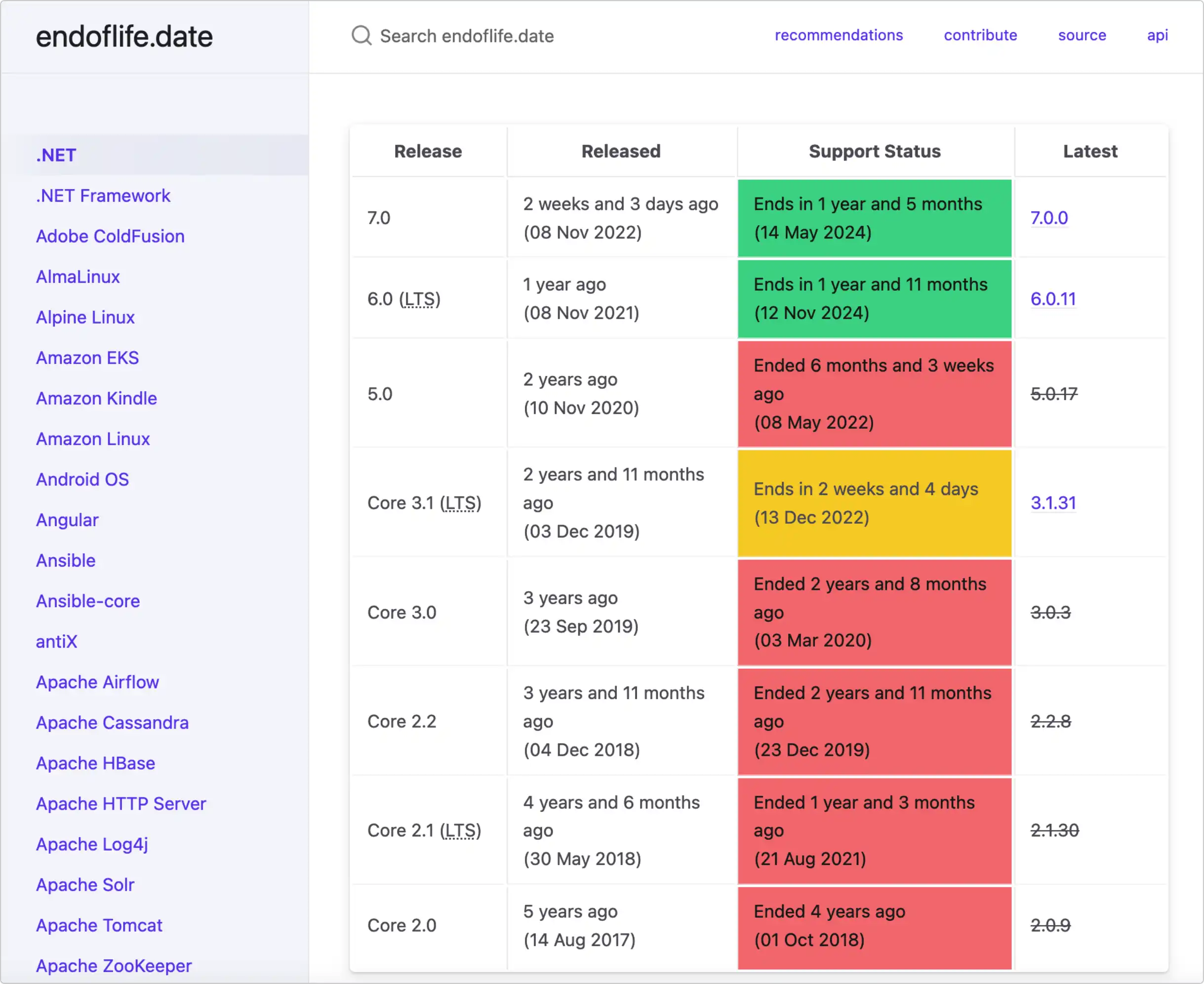 这个网站统计了所有开发语言,软件的申明周期,比如查看 .NET 会出现如下结果: