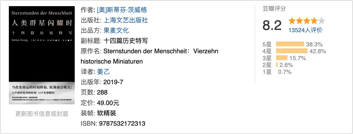高晓松也在节目中说:“我几乎很少向大家推荐书,不知道要推荐哪本。但我觉得极好极好,或者说现在就能推荐的,就是我本人非常热爱的《人类群星闪耀时》。”
