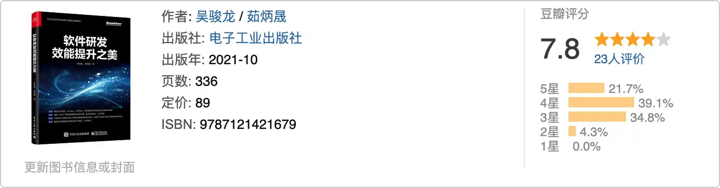 再加上软件研发效能是任何一个开发者或开发团队都非常关注的,所以便买回来看了,书中以研发效能提升为主导,涉及项目管理、工具使用、运维、组织等,最后还给出了一些案例,总体来说,每一个点不是特别深入,但还是很有启发。