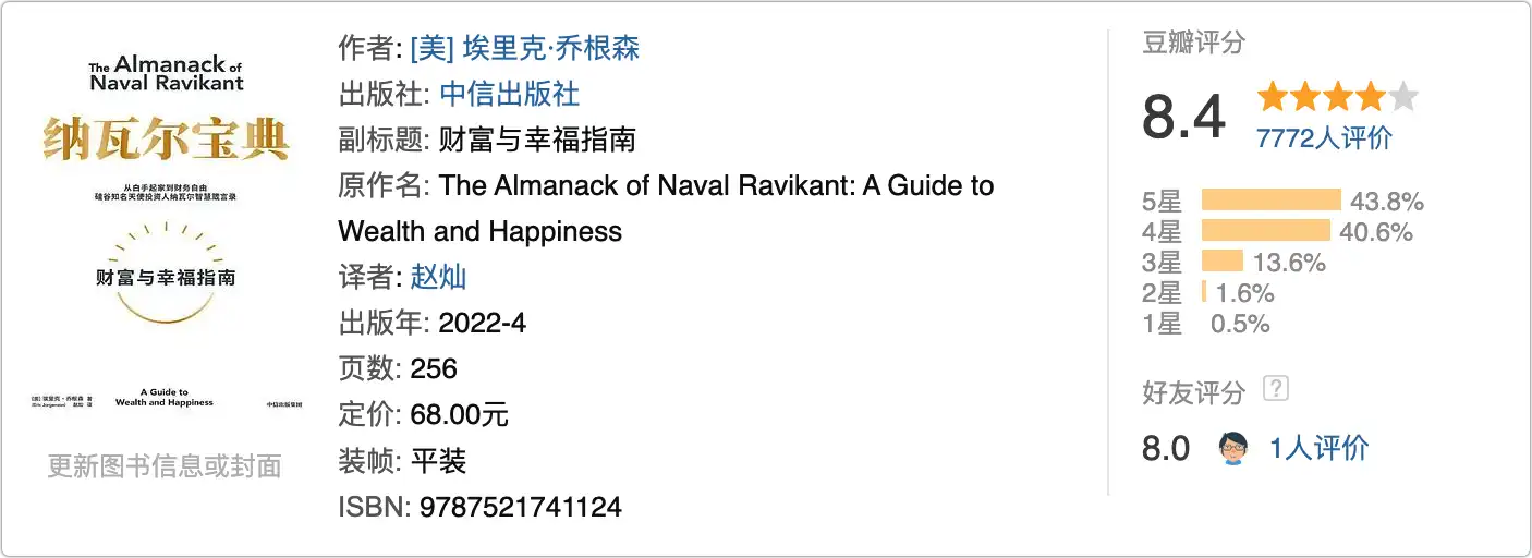 最早在量贩冰糖的播客听到介绍《纳瓦尔宝典》这本书,播主写了这本书的推荐序,另一篇推荐序的作者是樊登。这本书在豆瓣的 2022 年读书榜单的商业经管板块排名第一。