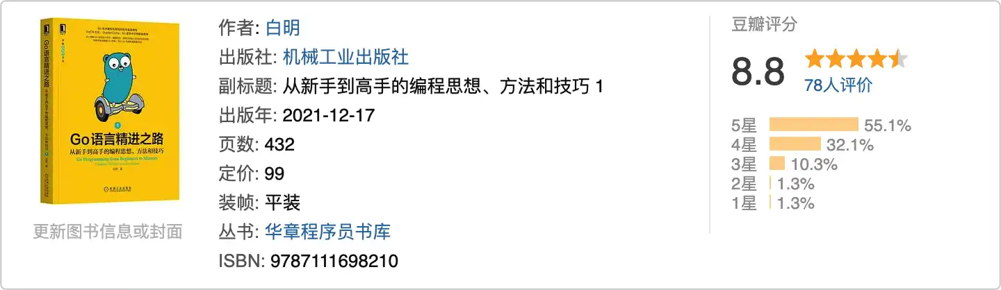 2022 年出版的《Go 语言精进之路》个人感觉还不错,作者 Tony Bai(白明),资深架构师、tonybai.com 博主,是 Gopher 部落技术社群发起人。2015 年就在自己博客上开始分享 Go 相关的知识,有非常丰富的实战经验。