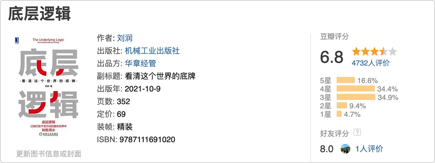 本书作者是刘润,在得到上有课程《5 分钟商学院》。也是在得到上知道的这本书,这本书在豆瓣上的评分不是很高,褒贬不一,不过我看着觉得挺好。