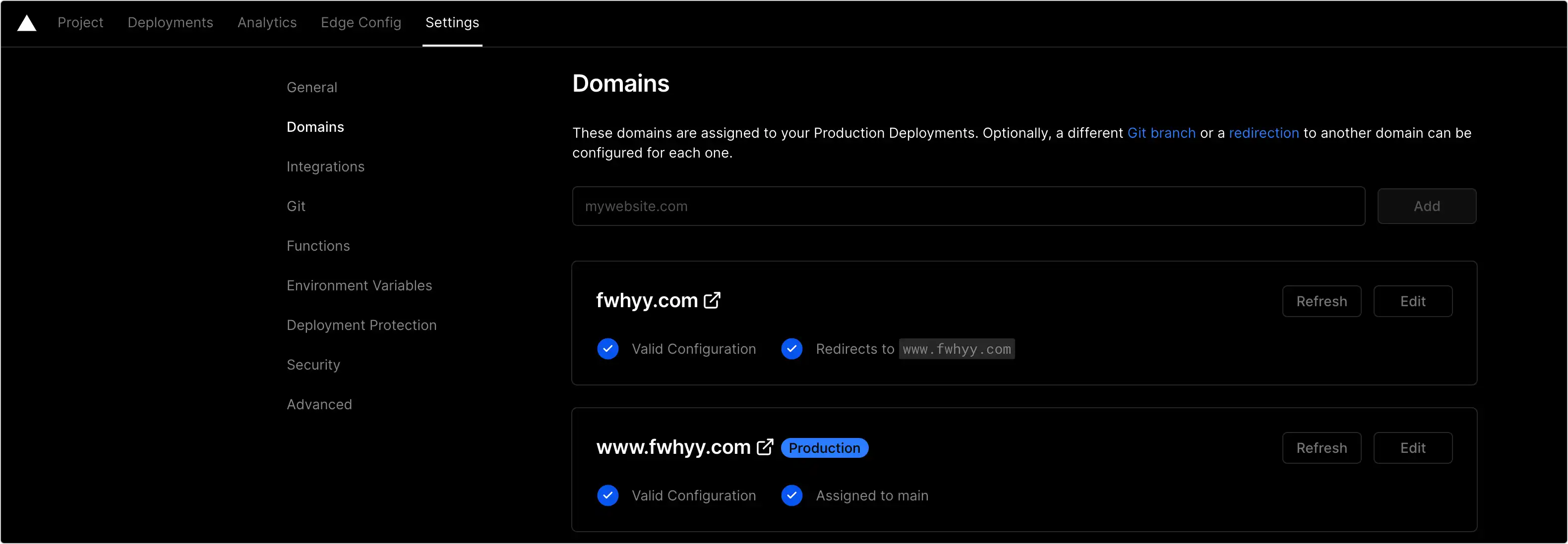 5、在 vercel 中进行域名的添加,解析正常如下图: