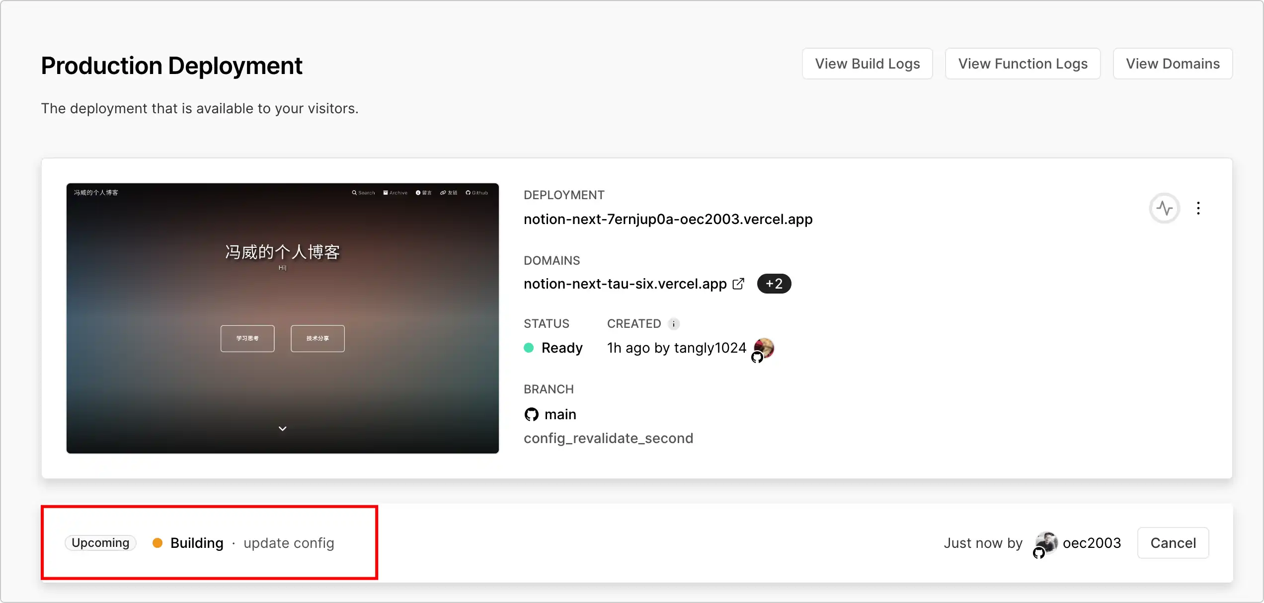 配置中的项都有注释说明,也可以自行修改,然后执行 yarn dev 在本地运行看效果。调整完成后,将代码 push 到 Github 后,vercel 会自动进行编译和发布: