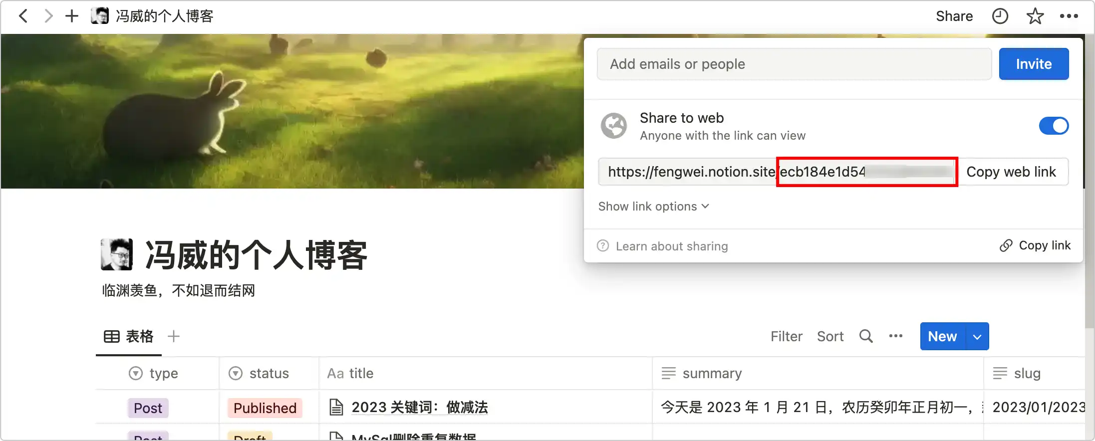 Notion 的 Page ID 在 Notion 的页面点击 Share 后的地址中获取: