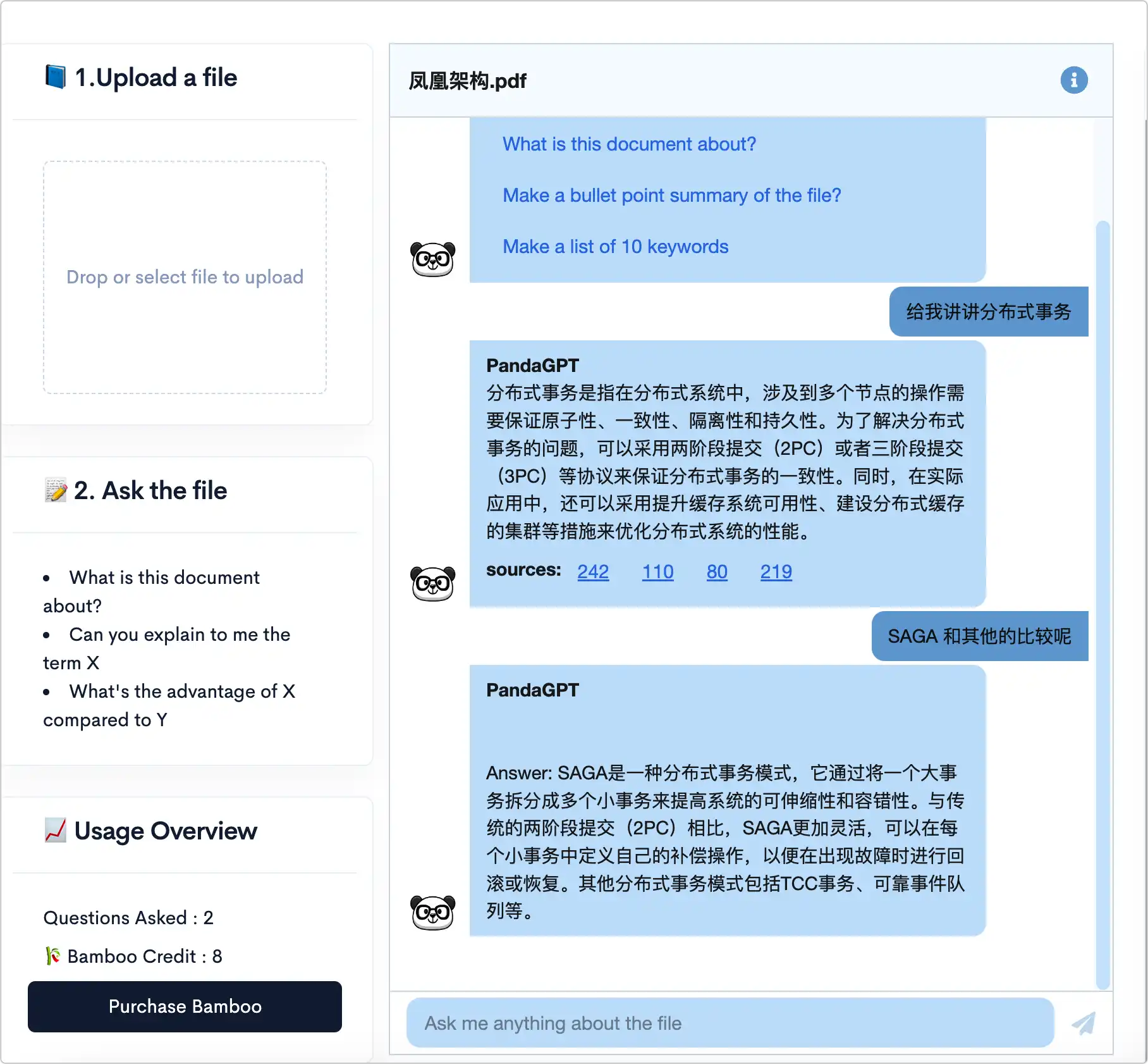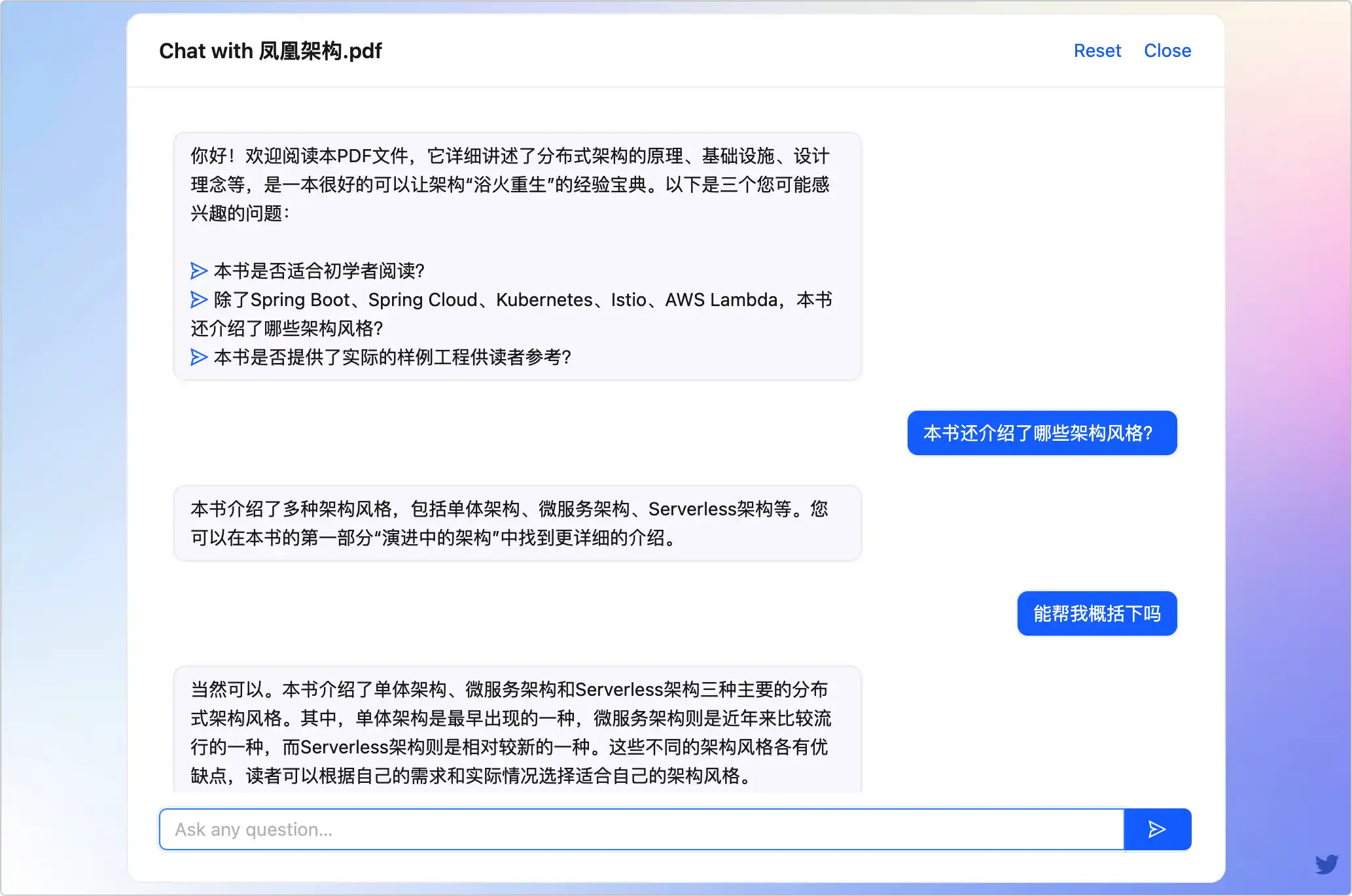 这个和 ChatPDF 有点类似,也是可以帮助我们来阅读 PDF 文件,免费版我将 《凤凰架构》整本书都上传成功了。同样,也是通过问答的方式进行使用: